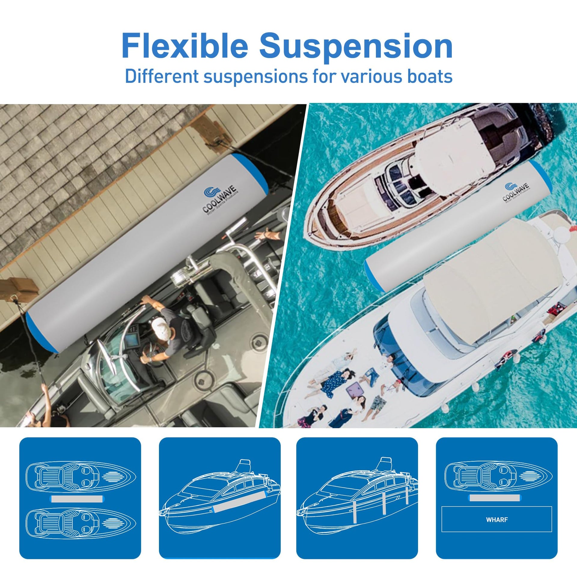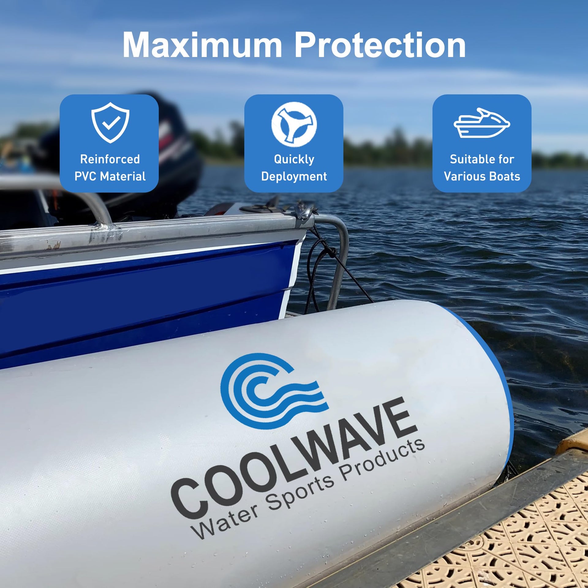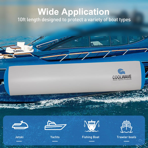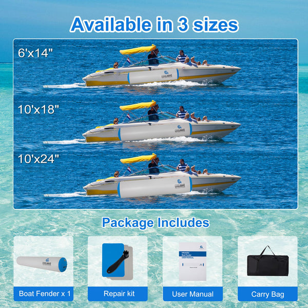 COOLWAVE inflatable fender, the ultimate accessory for boat owners seeking to protect their vessels while enjoying a worry-free experience on the water. These durable and reliable 10'x24'' boat fenders are specially designed to protect your boat from potential damage caused by collisions with docks, other boats, or any hard surfaces. Choose boat bumpers today and ensure that your boat remains safe and secure during all your aquatic adventures. With its durability, ease of use, multiple boat connectivity, convenient storage, and included repair kit, the COOLWAVE inflatable fender is an essential accessory for every boat owner.