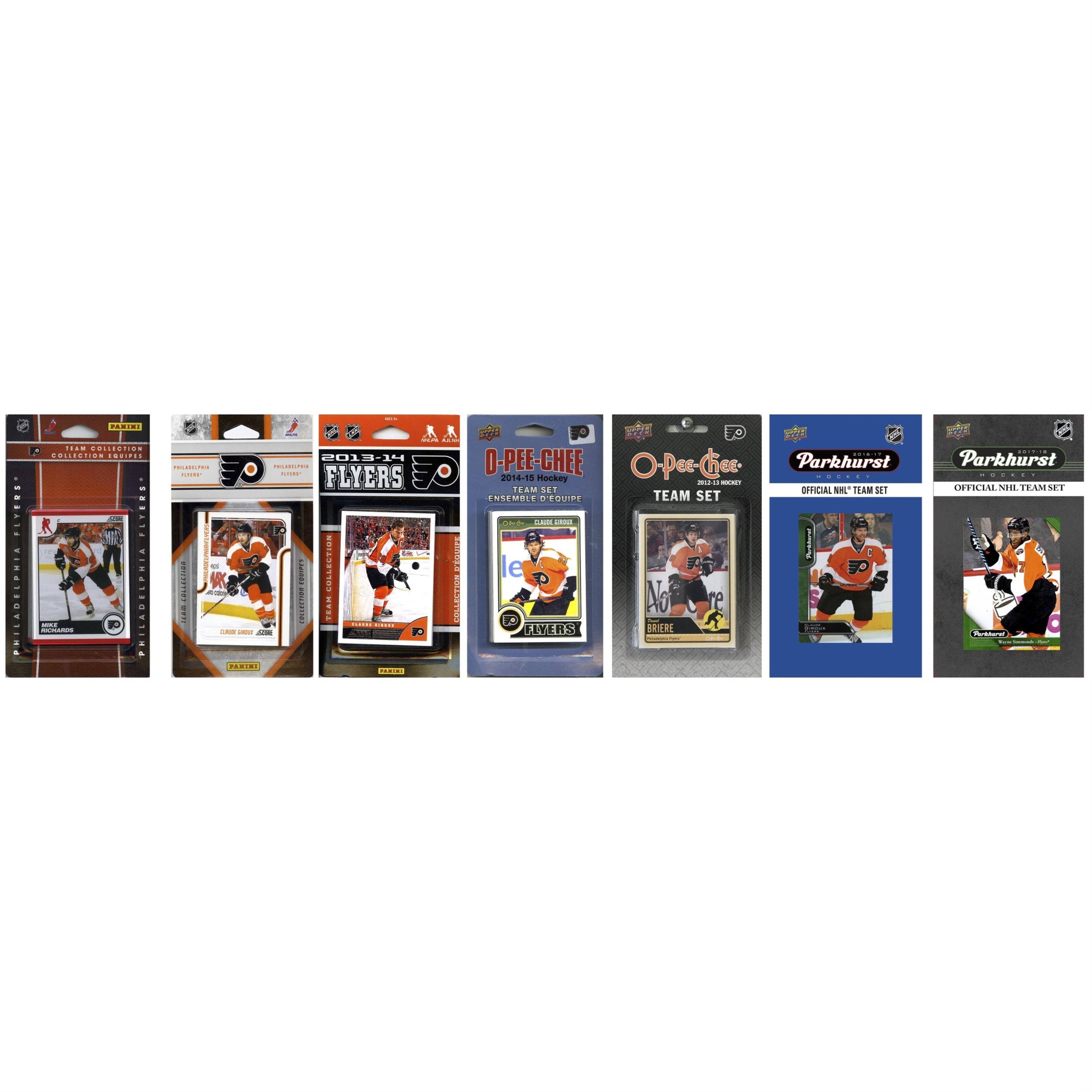 This package is a must for all Philadelphia Flyers fans. You'll get Official Score NHL team sets from 2010, 2011, 2013, a 2012 and 2014 O-Pee-Chee team set and a 2016 and 2017 Parkhurst Team Set featuring your favorite Flyers players.