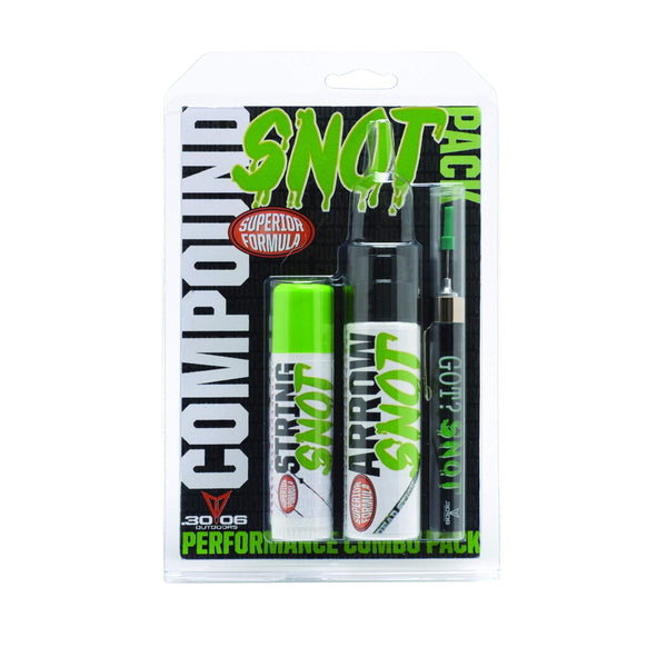 The .30-06 Outdoors Snot Lube combo 3 pack for compound bows includes 1 each string snot (string lubricant), bow snot (parts pen oiler) and arrow snot (arrow release fluid). This is a complete kit of high performance lubricants for your compound bow.