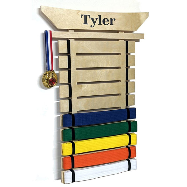 All wood belt rack Made in the USA Personalize this product with any name up to 12 characters, uppercase and lowercase Holds 10 martial arts belts Students can proudly display all of their martial arts belts Includes pre-installed wall mounting brackets and elastic bands Belts not included Size: 185 Wide x 30 Tall - Handmade in the USA