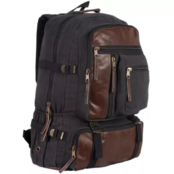 487-99598437718 Retro Cantabrian Excursion Rucksack - Black manufactured by Fox Outdoor Products. Retro Cantabrian Excursion Rucksack. Extra-large main compartment with zippered closure Dual front zippered compartments 3 zippered accessory pockets 2 outer open top dump pockets Quad cinch straps Padded back Padded, adjustable shoulder straps Hanging hook Hanging hook Grab handle Color washed canvas with genuine leather trim