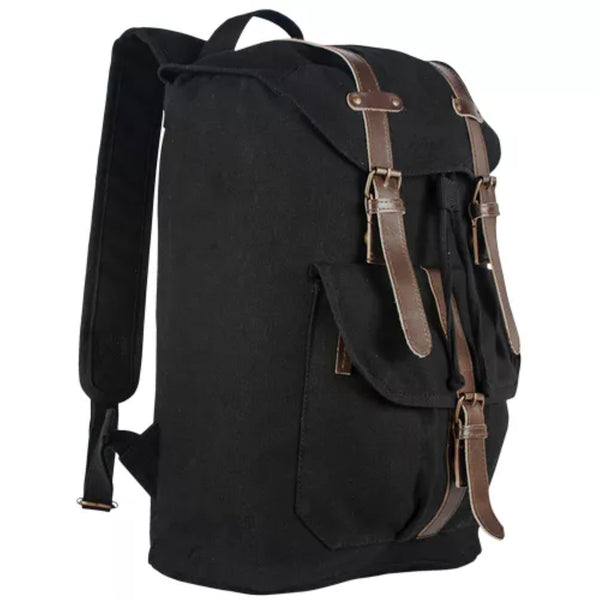 487-99598432218 Retro Madridian Rucksack - Black manufactured by Fox Outdoor Products. Retro Madridian Rucksack - Black. 1 large deep main compartment with draw-cord closure & storm flap with leather strap closure Padded open-top sleeve pocket in main compartment ideal for laptop storage 1 bellowed front pocket with zippered closure and storm flap with leather strap closure Genuine leather straps with magnetics snaps on both storm flaps add visual appeal while providing instantaneous closure Fully adjustable padded shoulder straps Grab hook Cotton canvas construction