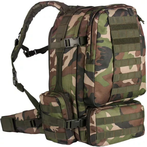 487-99598562434 Advanced 2-Day Combat Pack - Woodland Camo manufactured by Fox Outdoor Products. Advanced 2-Day Combat Pack - Woodland Camo Capacity : 48 Liters / 2,926 Cu.In Compartments : 3 Pockets : 6 Internal / 4 External Made of Extra Heavy-Weight 600 Denier Material Main compartment w/ 2 large mesh pockets & 4 cinch straps Front compartment with a multitude of accessory pockets Zippered side-access pocket on front compartment 2 side pockets & large bottom pocket Quad side compression straps with Quick Release buckle system Web carry handle & dual hydration ports Loop panels for IDs & patches Zippered hydration pocket Keep-cool Padded backing Adjustable padded shoulder straps Removable kidney belt Comes with a 2'' x 3'' Fox Tactical patch in matching trim color