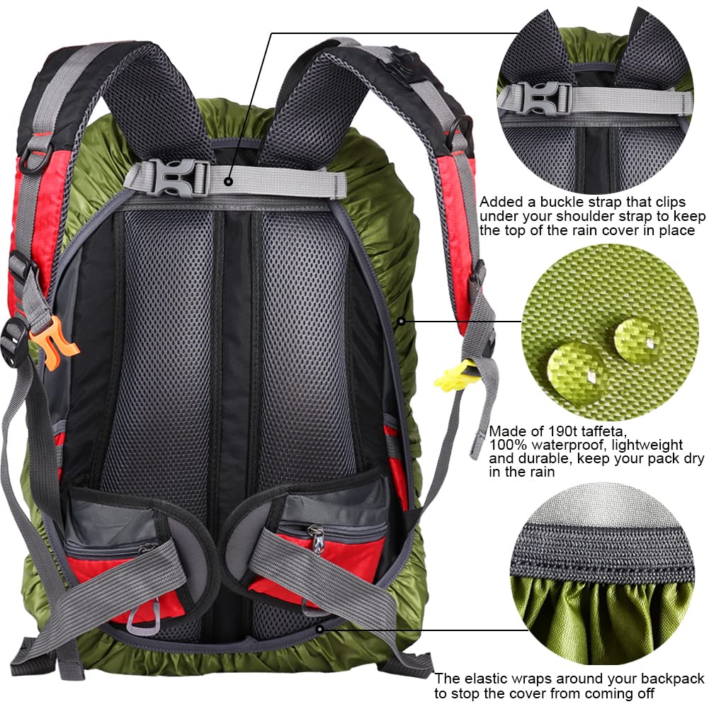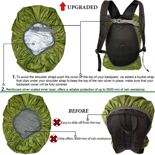 Unlike other backpack rain cover, we add a buckle strap at the top of the cover to prevent it from slipping off your backpack Our backpack cover provides all around protection for your backpack and keep your backpack always dry when its raining, snowing or foggy, also its dustproof and scratchproof Its a necessity for your traveling, camping, hiking, riding, cycling ect Fits all backpacks like travel bag, hiking bag, camping Bag, laptop backpack, college school bookbag, business backpack and internal frame backpack Please consult our size chart, then choose the right size and your favorite color Size chart: 15 - 25L: (Height: 135 - 185in, Length: 118 - 146in, Width: 59 - 79in) 30 - 40L: (Height: 185 - 217in, Length: 118 - 146in, Width: 59 - 79in) 40 - 50L: (Height: 217 - 264in, Length: 118 - 146in, Width: 59 - 79in) 50 - 60L: (Height: 256 - 272in, Length: 118 - 146in, Width: 78 - 10in) 60 - 70L: (Height: 272 - 295in, Length: 118 - 158in, Width: 78 - 119in) 70 - 80L: (Height: 295 - 335in, Length: 136 - 178in, Width: 97 - 138in)