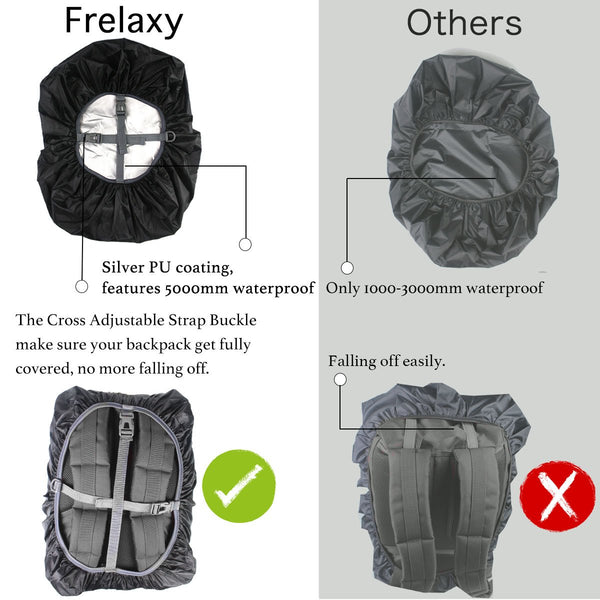 Frelaxy Backpack cover is perfect for outdoor, hiking, camping, traveling, riding, climbing Protect your backpack from dust wind, scratch, sand, bad weather, water, rain, fog, and snow Suitable for Hiking Backpack, Travel Backpack, Schoolbag, Laptop Backpack, camping Bag even luggage under 90L Professional grade Features:ULTRA-STRONg WATERPROOF: Inner layer cover with Silver PU coating offers a reliable protection of up to 5000 mm of rain resistance, which is the highest waterproof grade, Ideal for any rainy activities UPgRADED DESIgN FOR ALL-OVER PROTEcTION: The Vertical Adjustable Straps provided for extra stability and make sure your backpack get fully covered, no more falling off Made of 190T Nylon features WEAR-RESISTINg and DURABLE, protecting backpack from scratch, dirt, sand Lightweight & Portable: Each backpack cover comes with a waterproof storage pouch that you can just clip it to your backpackAvailable in 5 sizes (for backpack from 15L - 90L) and multicolor for the perfect look and fit Size chart: S:15-25L (Height:134-177in Lenth:11-126in Width:59-7in) M:25-35L (Height:177-205in Lenth:126-146in Width:59-7in) L: 35-50L (Height:205-236in Lenth:126-146in Width:7-86in) XL:50-65L (Height:236-275in Lenth:126-146in Width:86-98in) XXL:65-90L (Height:275-335in Lenth:146-165in Width:98-11in)(If you are planning on stowing things on the outside of your pack, We would recommend getting a size up so that it will easily cover your entire pack) FREE Exchange size if not match without RETURNINg & WORRY-FREE 12-MONTH WARRANTY & LIFETIME cUSTOMER SERVIcE