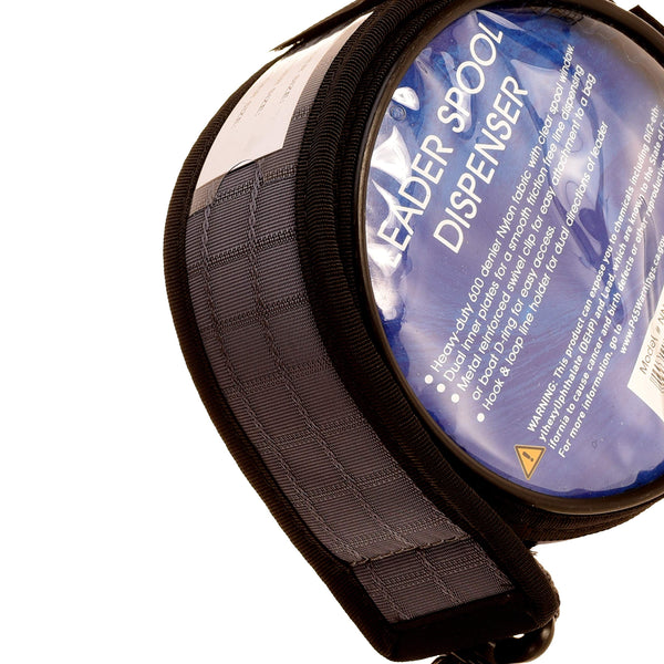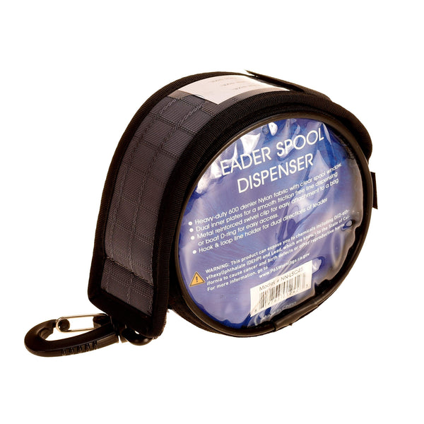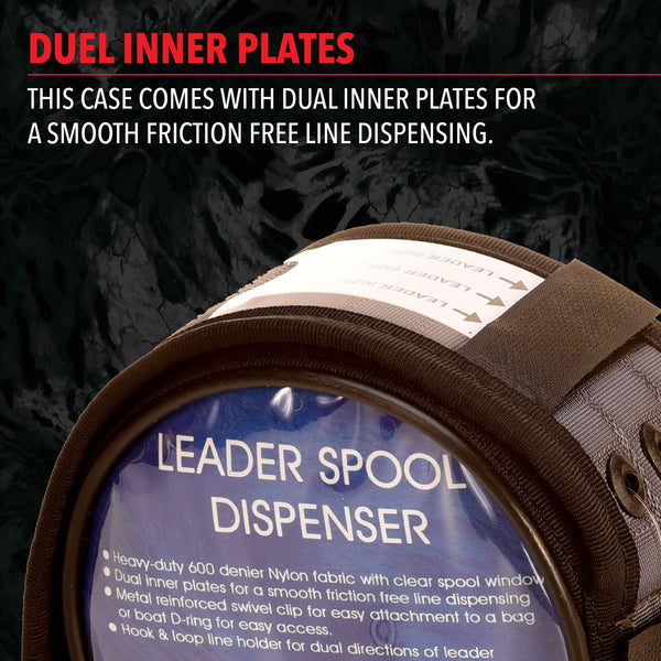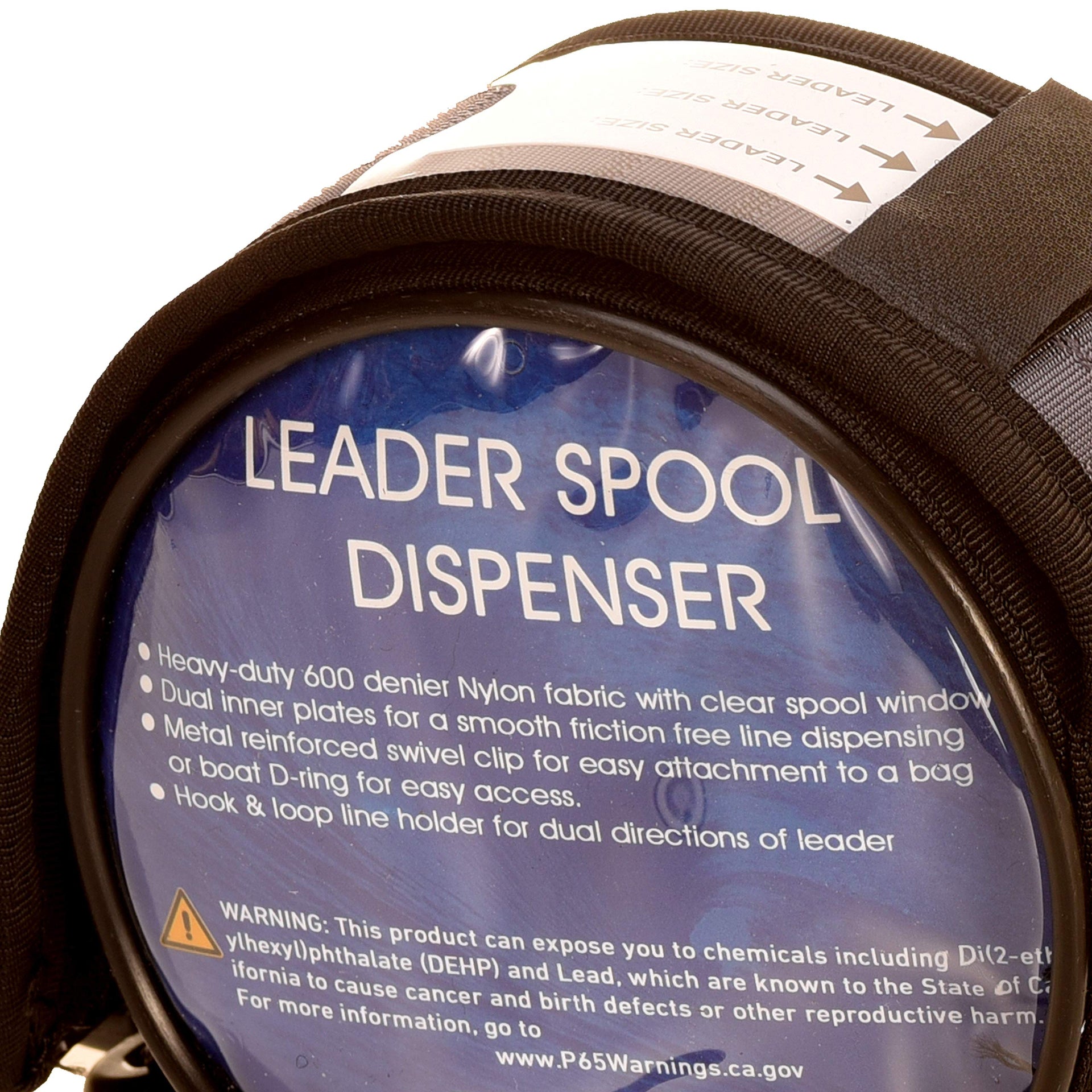 Leader line holder stores 3 spools of fishing line at a time; size largeMade with heavy duty 600D nylon and a clear spool window for easy identificationDual internal plates ensure smooth, friction free line dispensingFeatures hook and loop line holders for dual direction leader linesAttach case to a bag or boat with the metal reinforced swivel clip