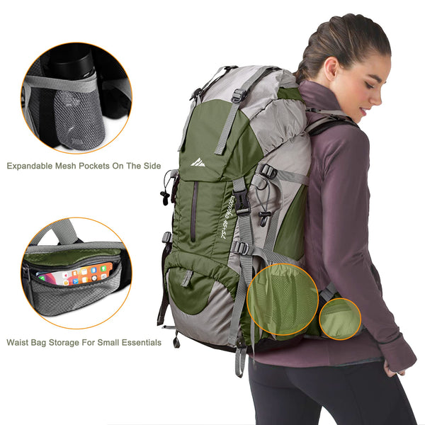 Features: * Ergonomic padded shoulder straps and back support for best ventilation and easing burden in order to make carrying the backpack more comfortable. * Chest belt and waist belt are available to adjust. * Crafted from water resistant and tear resistant nylon fabric, very much durable. * Rain cover stored in a bottom pocket which could protect your camping bag does not get wet in a raining day. This pocket can also be used for storage of additional small items (like plastic garbage bag etc.) Organized Compartment: -1.Main Space for most of travel and sports necessities. -2.The zipper on the bottom of the bag for you no need to dig or dump stuff out to reach what is needed. -3.Surface Zipper,Special for your cell phone, MP3 player, snack bar and so on -4.Hipbelt Zipper,Large enough for a cell phone, camera,keys,snacks,or small items you like to have easily accessible. -5.Inside Zipper pocket,Safe to keep your important articles. -6.On the sides, there are 2 very deep mesh pockets with elastic collars for holding your water bottels and umbrellas. These are very roomy and secure. Specifications: Item type: Hiking Day pack Gender: Unisex (Men,Women) Material: Water-resistant, rip-stop Nylon Capacity: 50L(45L+5L) Load-Bearing: 40KG(88lb) Size: Approx. 60 * 30 * 20cm / 23.6 * 11.8 * 7.9in Weight: Approx. 1070g / 2.35lb package Size: 22.28x14.72x 3.15in Package Weight: 2.36lb Package List: v 1 * Outdoor Backpack v 1 * Rain cover