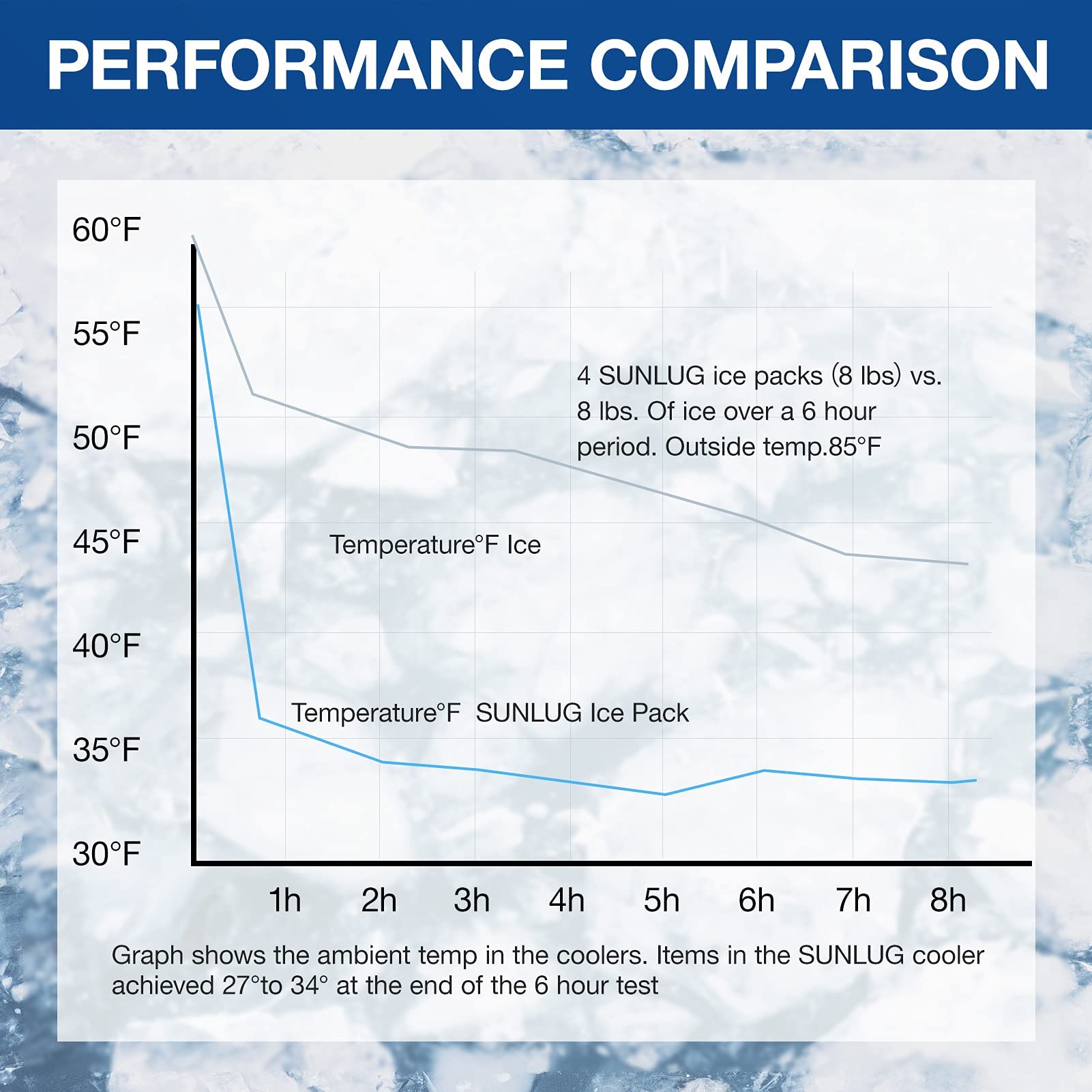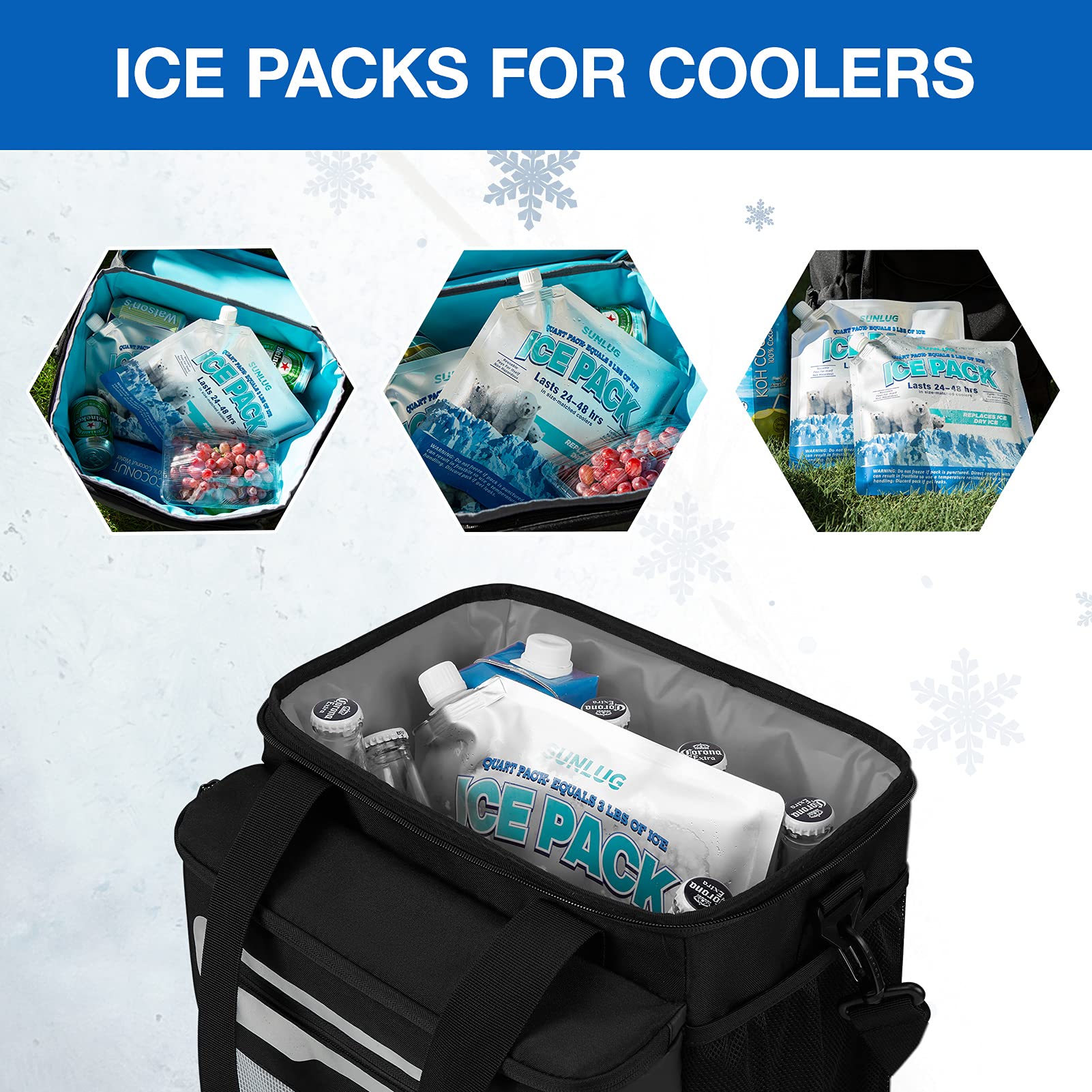 SUNLUg cooler Ice Packs --A substitute for traditional ice cubes & regular water and has a colder & Faster & Longer cooling performance Key Features & Specs Each ice pack size - 975 x 975 x 1 inches Included in a set - three corks & one funnel Each pack need fill in 28 ounces(3 12 cups of 8oz)of water Save more space for your coolers & Extended the food and drinks cooling time Add Water Once & Reusable The inside of the ice pack is filled with a proprietary cooling gel mixture, just add water at home, shake and seal, and then turn it into a solid block after freezing, which creates a reusable ice pack Superior cooling Performance SUNLUg ice packs start out at freezer temperature and gradually heat up Throughout the melting process, ice packs maintain the advantage of a lower melting point than traditional ice cubes When the ice starts to melt and warm in your cooler, ice packs still remain cold, even as they begin to thaw REUSABLE Just add water once and return the ice packs to the freezer after using and theyll be ready for your next outing Save your money spending on ice cubes LONg LASTINg cOLD colder & Faster & Longer Ice Packs, the best ice alternative Keep your food and drink chilled longer NON-TOXIc Feel safe using cool coolers and sending them with your kids Keep your food or drinks cold for a long time BPA FREE SUNLUg Ice Packs made of high-quality BPA-Free materials Designed to keep cool without harming the environment, and promote sustainability