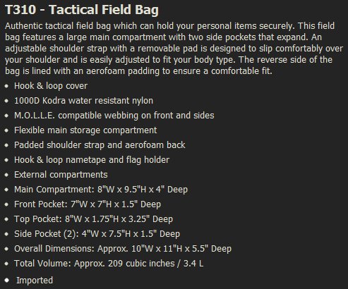 T310-BLK Tactical Field Bag, Black, Black The Tactical Field Bag is perfect for an EDC (every day carry) bag. It is designed to carry your personal items in an organized and secure manner. The zippered pocket on the top is great for carrying goggles or glasses.The two pockets on the