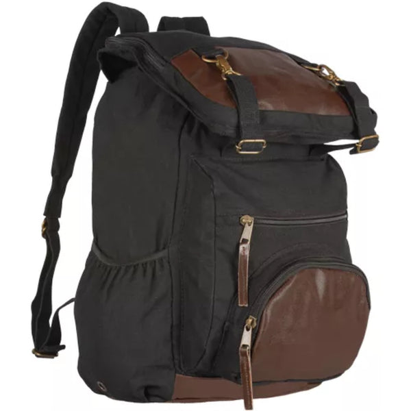 487-99598043414 Tahoe Excursion Rucksack - Black manufactured by Fox Outdoor Products. Tahoe Excursion Rucksack - Black 1 large open top compartment with draw-cord closure 1 over-size storm flap with zippered pocket Padded sleeve pocket in main compartment, ideal for storing a laptop computer or electronic pad 2 zippered pockets on front face provide storage for small items and quick access 2 side open-top pockets with elasticized ends for storing water bottles or items such as a compact umbrella Fully adjustable padded shoulder straps Canvas web grab handle Color washed cotton canvas construction with genuine leather trim on bottom, front pocket and storm flap