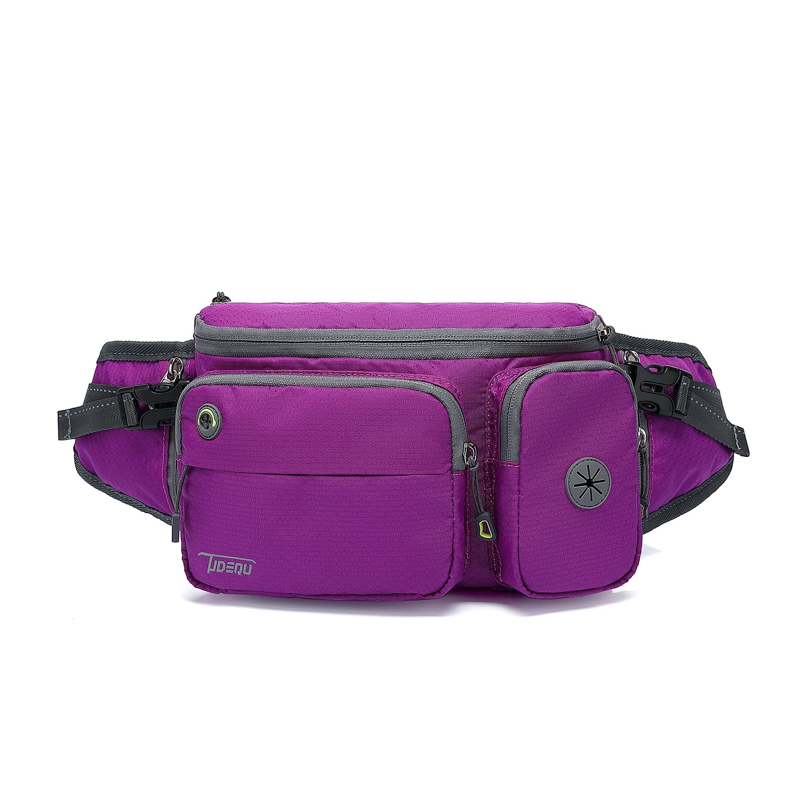 This versatile fanny pack can be used as a Hiking Waist Pack, Dog Treat Pouch, Walking Bum Bag or Running Waist Bag etc DIFFERENT cOMPARTMENTS HOLD A LOT- There are 8 pockets in the waist bag The front large pocket can fit most plus phones up to 65 inches The front small pocket can put poop bags, tissue or mobile power ect The sunglasses pocket on the top can protect your sunglasses away from crushing The largest compartment can put towel, snacks, dog food and note book ect You can put yours and your petsA items in one waist bag 2 HIDDEN WATER BOTTLE HOLDERS- There is a zippered sleeve on either side with mesh sleeve that you can pull out to hold water bottle It can accommodate a diameter up to 375cm bottle You can take your and petAs water bottle together ADJUSTABLE WAIST BELT & STRONg METAL D-RINgS- The waist belt range is 24562cm to 52132cm The metal D-rings are in the both sides of the waist bag, so you can go out with two pets simultaneously REFLEcTIVE DETAILS & HEADPHONE SLOT- The waist bag has reflective stitching zipper and LOgO, and also the adjustable strap has reflective threading All these reflective details are not only fashionable, but also safety for you while in the traffic or night activity complete with headphone hole, so you can enjoy the music during running WATER REPELLENT & BREATHABLE MESH PAD- This is a water repellent waist bag The water-resistant fabric will keep your items away from raindrops, sweat and moist The back and the side all well padded, they will make you feel comfortable when you wear it MULTIFUNcTIONAL WAIST BAg- This waist bag can be used with your pet or alone Metal D-rings on both sides can allow you to take two pets or hang some items Weight: 077 pounds350g Dimension: 95A x 26A x 65A LxWxH (24 x 66 x 165cm) Package Includes:1 x TUDEQU Waist Bag (Water bottle and umbrella are not included)