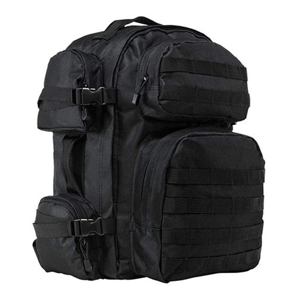 Tactical Backpack, Black Features: - Large zippered clam-shell main compartment, internal zippered pocket and a separate divided compartment for a hydration bladder - Padded shoulder straps, waist and sternum straps, two adjustable compression straps on each side, and six external zippered pockets - The front pockets and bottom of the back pack has PAL compatible webbing to make the Tactical Back Pack a modular system - Carry handle straps on the top and on both sides of the back pack