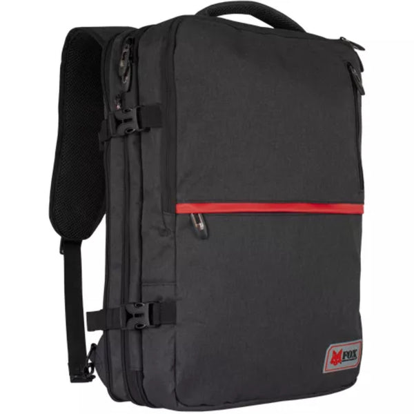 487-99598545413 Voyager Hybrid Travel Pack - Slate Grey manufactured by Fox Outdoor Products. Voyager Hybrid Travel Pack - Slate Grey Capacity : 1,299 Cu. In / 21 L - expanded: 1,819 Cu. In / 30 L Compartments: 3 1) Front organizer compartment with 2 document sleeves & 2 zippered pockets 2) Expandable travel compartment with butterfly fold-out feature, ideal for 1-3 days of clothes 3) Fold-out back electronics compartment Upgraded, water-resistant polyester shell Durable P.U. coated polyester lining Nylon coil self repairing zippers throughout with hardened rubber-tipped chrome zipper slides Concealable, rapid-attach padded shoulder straps Deluxe padded & vented back panel with luggage handle sleeve Padded laptop & tablet sleeve with 3 accessory pockets in electronics compartment Quick access pocket on shoulder strap, great for cash, cards and tickets