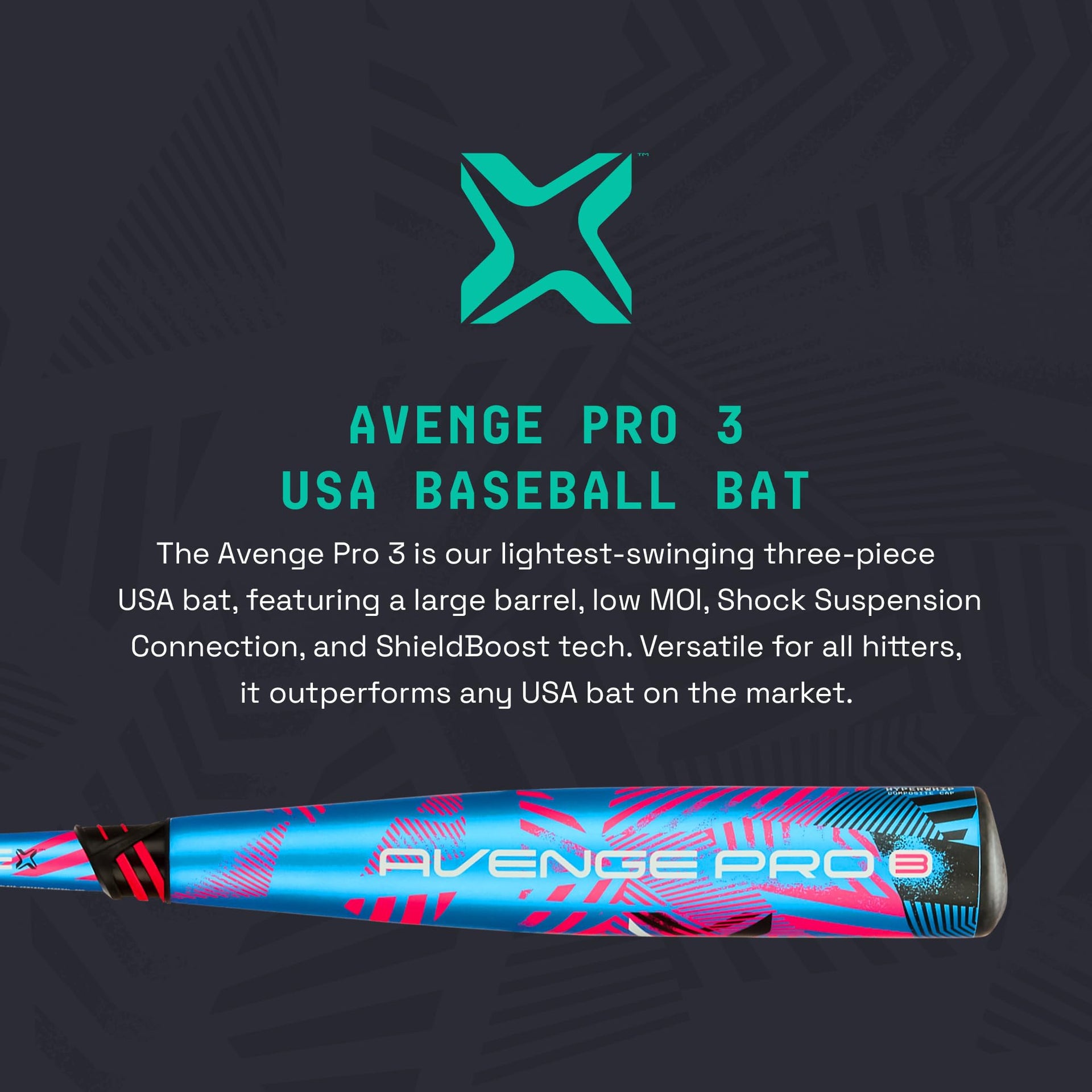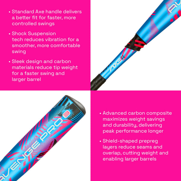 The lightest-swinging two-piece USA bat weve ever produced, the Avenge Pro 3 combines our largest barrel with our lowest MOI. When combined with the vibration-dampening Shock Suspension Connection and ShieldBoost barrel tech, youre left with the most versatile bat in the game - fit for hitters one though nine in the lineup, the Avenge Pro 3 will deliver unlike any USA Bat available today. How is this different from previous model: First of its kind model: ShieldBoost Barrel Tech contributing to longer barrel, HyperWhip Composite Cap, Shock Suspension Connection - lightest swinging USA Bat we offer. Axe Handle Description: Standard Axe Handle - Speed and Control: The patented Standard Axe Handle ensures a precise connection and fit, enhancing your ability to swing faster and with greater control every time you step up to the plate. Material Description: Charge Carbon Ultra- Complex polymer matrix keeps individual layers thin. Allowing for performance right at the allowable legal limit. Barrel Tech Description: ShieldBoost - Asymmetric barrel layup allows carbon and fiberglass prepreg layers to be wrapped with fewer seam lines and less overlap creating massive weight savings and more durability. This new barrel technology directly translates to larger barrels, higher performance, and fewer breaks. Connection Description: Shock Suspension Connection - Industry leading vibration dampening technology intercepts vibration at the connection point. The result is your smoothest, most comfortable, and highest-performing swing. Endcap Description: HyperWhip Composite Endcap - Sleek design and the carbon fiber material save weight at the tip of the bat for a faster, more efficient swing and larger barrel. Warranty Description: 1 Year