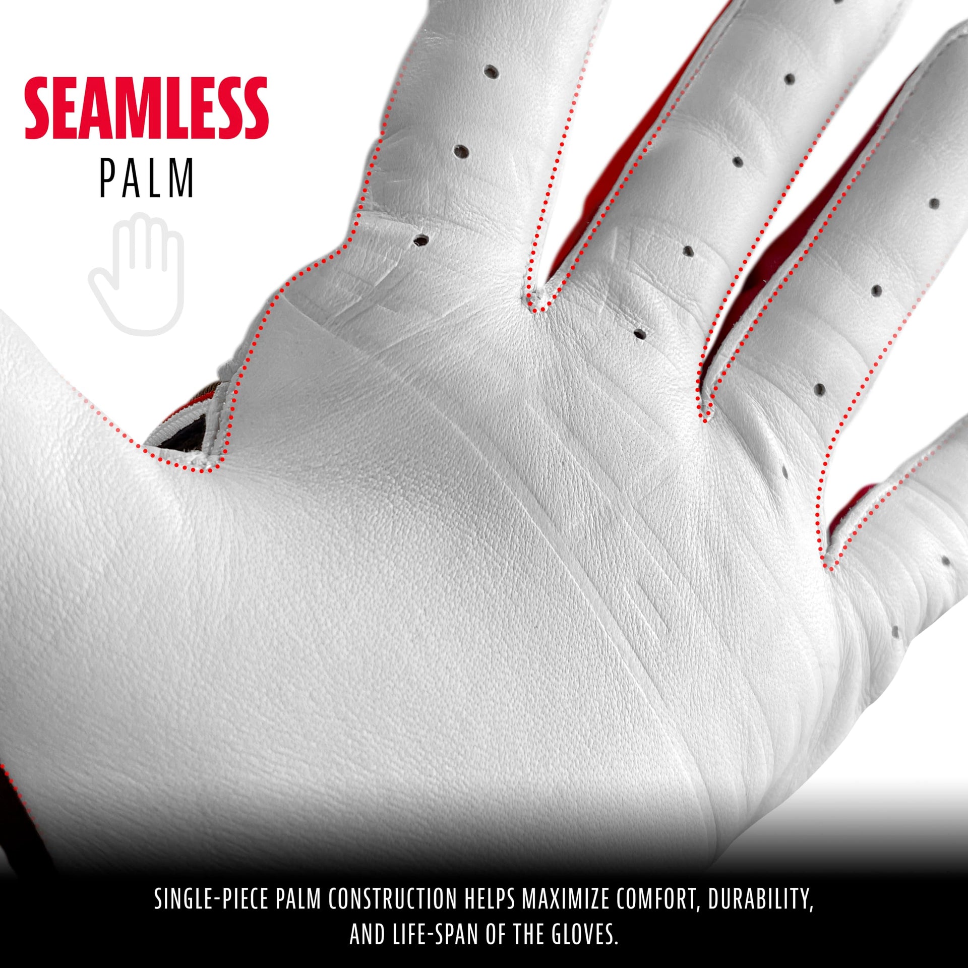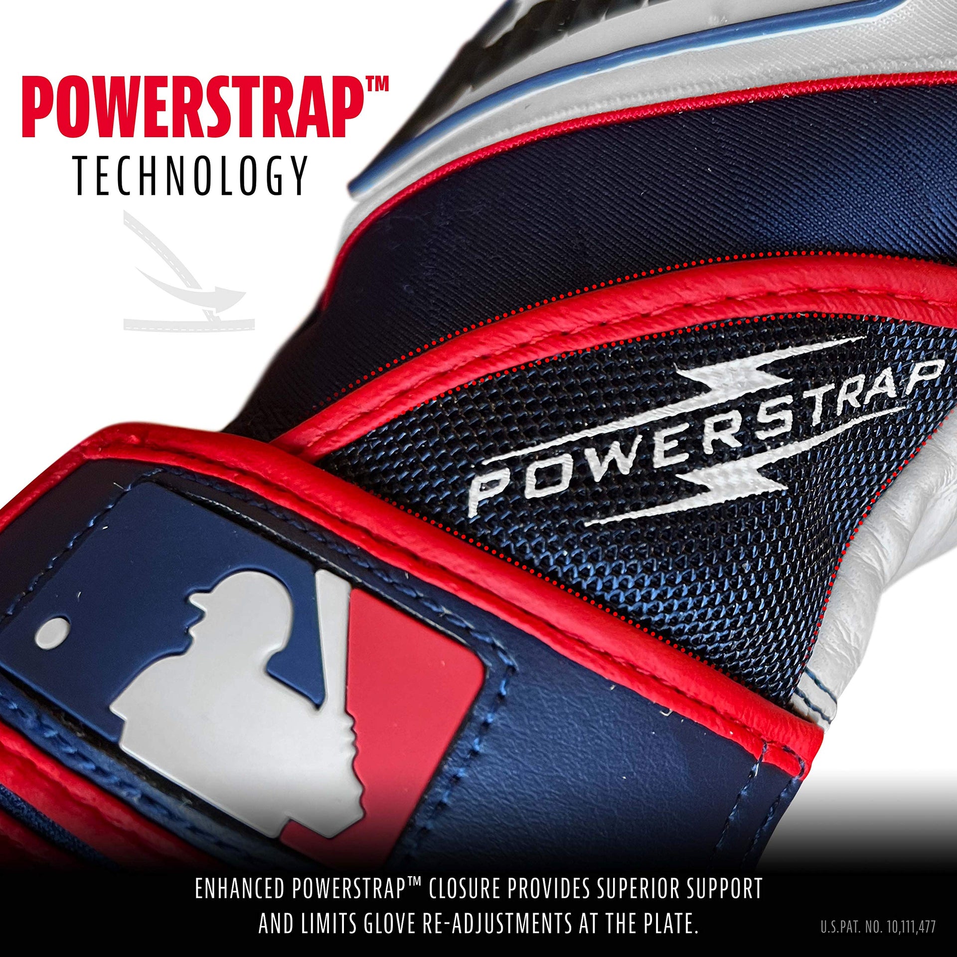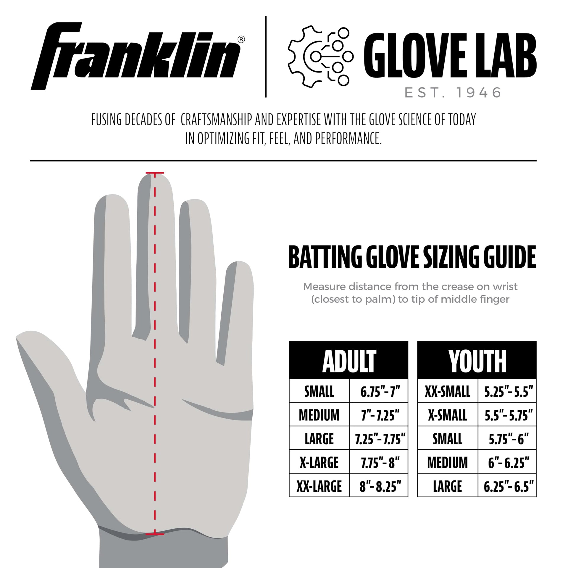 Introducing the revolutionary new power strap Series of batting gloves from Franklin Sports. Working closely with Franklin's professional MLB athletes, they have engineered the perfect fit wrist-closure system. No adjustments will be necessary at the plate. snug fit and feel. This glove features Franklin's high-quality, one-piece Pittards smooth sheepskin leather palm that promises softness and superior grip in all conditions.