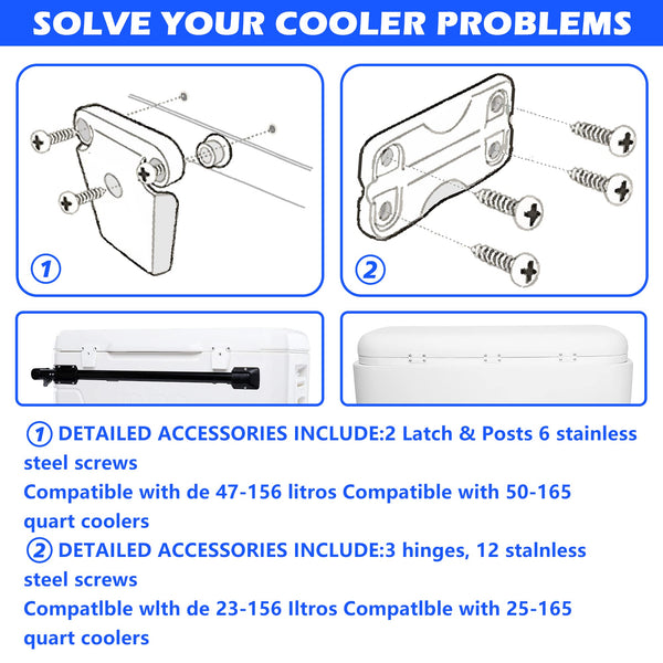 cooler Hinge and Latch Set: --When your cooler gets damaged,Replace the damaged cooler parts and make it work again, the cooler Replacement Parts Kit and cooler with hinge and latch are compatible with all lgloo coolers Please confirm that your cooler is suitable for the following models before purchasing: --compatible 25-165QT Igloo coolers --compatible 50-165QT Igloo coolers QUALITY AFTERSALES: With fast response and high-quality customer service, we are committed to providing each customer with a practical cooler Hinge and Latch Set If you have any questions, please feel free to contact us,Ln the package Warning: --In order to prevent accidental ingestion, please let you put the product properly and keep children away from it