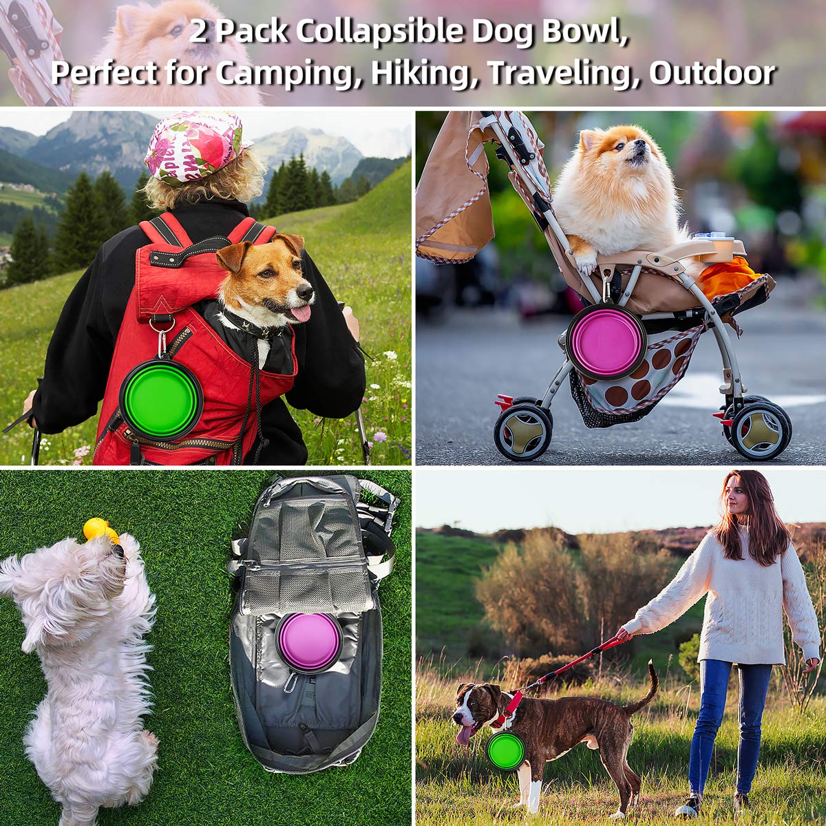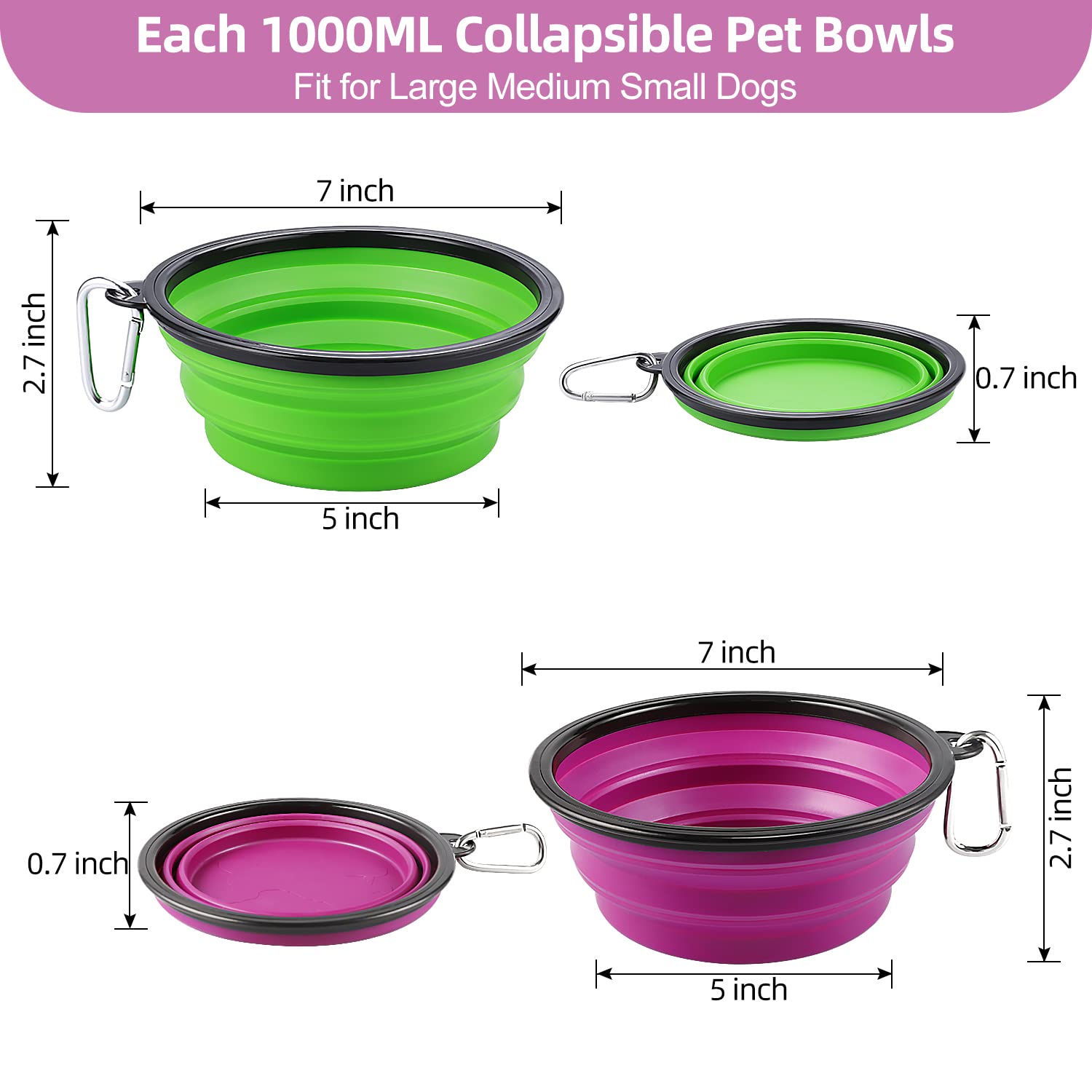 WIDELY USE Our Kytely collapsible dog bowls also can be used indoor as a normal pet bowl for food and water Each collapsible bowl with a carabiner, perfect for traveling, hiking, camping, walking, adventure LARgE cAPAcITY come with 2 different color collapsible pet bowls, one for food and the other for water Each bowl can hold up to 34 fluid ounces of water or 42 cups of pet food, suitable for Small, Medium and Large Dogscats to store water and food when going outside TAKE THE TRAVEL DOg BOWLS ON THE gO Easy to feed and water your dog on the go with Our Kytely collapsible pet bowls clip or collapsible the petcat dog bowl to your bag, dog travel crate, dog training leash or collapse flat for your pocket, stroller, and moreA PAcKAgE INcLUDED: 2 x Large collapsible Travel Bowls with carabiner clip