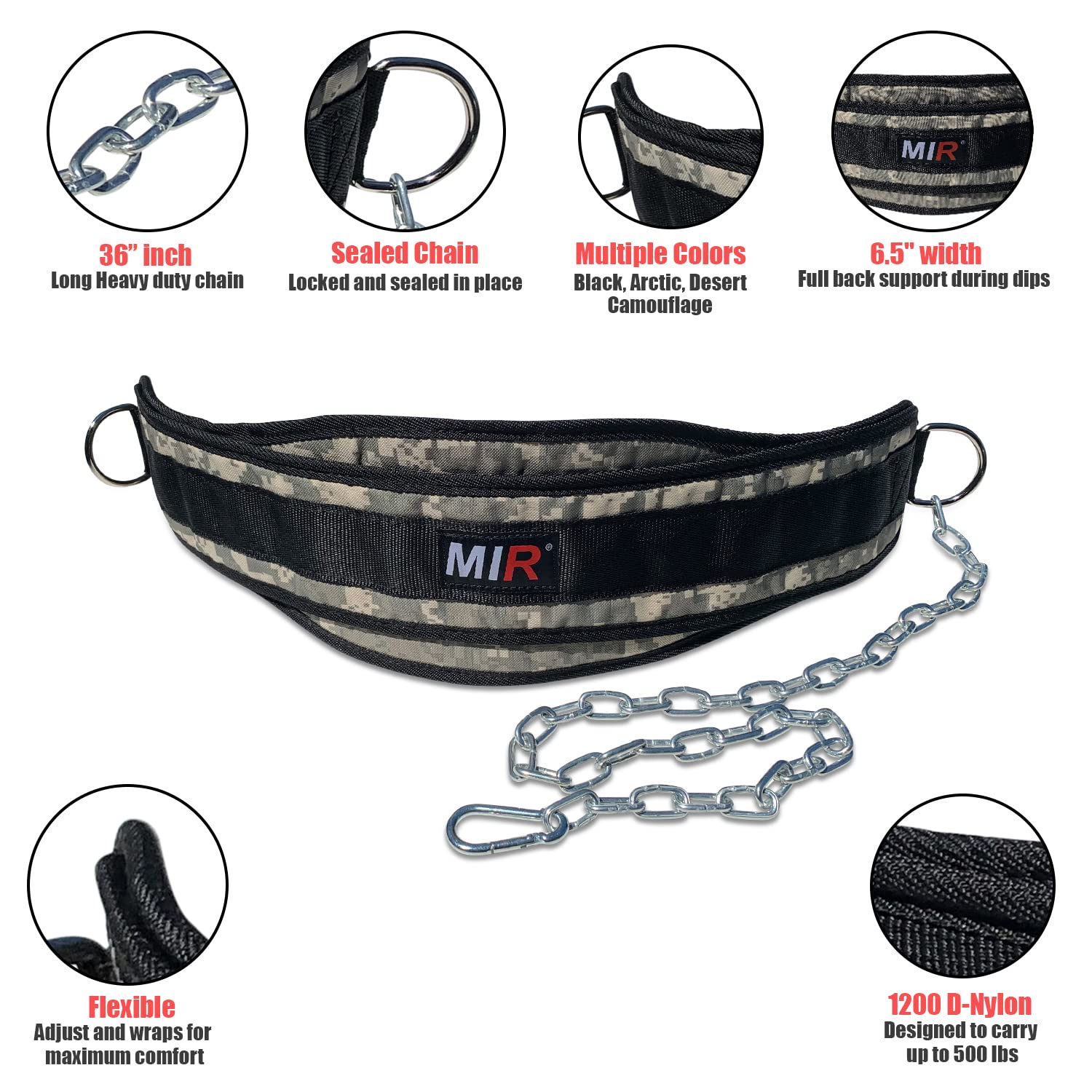 Mir weight lifting dip belt is made to work out every muscle in your upper body This includes triceps, biceps and your chest Use this dip belt for dips, chin ups and pull ups Attach any weight desired to your dips The dip belt is designed to hold up to 500lbs Its sleek design helps the dip belt contour to your body while widening in the back to offer back support The dip belt is designed like this to make sure you have full control of the weights, eliminating any chances of discomfort or swaying of the weights when in use The metal chain and safety clip hook offers maximum security when weights are loaded and will not snap or break This dip belt is a great alternative from our Mir champion weight belt