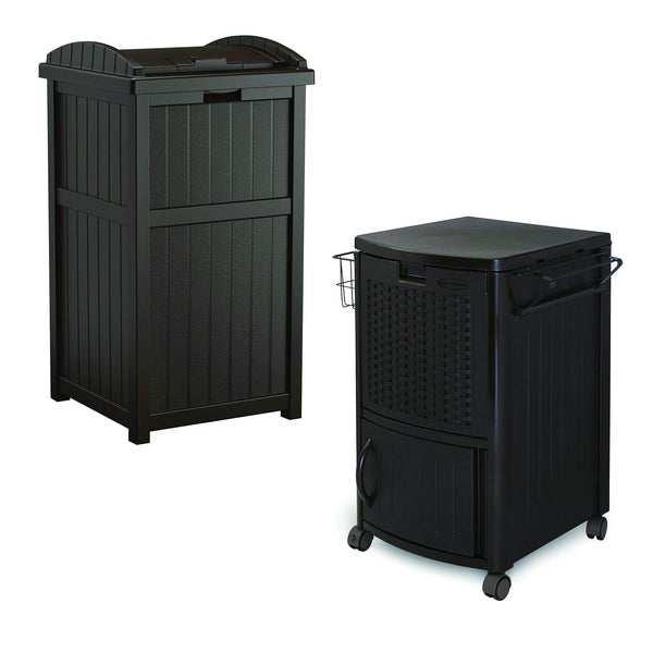 Bundle Includes: Patio Garbage Waste Trash Can & Patio Cooler w/ Cabinet & Wire Basket Hide your trash in this stylish outdoor Suncast Trash Hideaway Outdoor Patio 33-Gallon Trash Can. This stylish trash can has a latching lid that keep trash hidden, inside, and protected from the elements and critters. The trash can stands 31.6 inches tall and uses standard 30- to 33-gallon trash bags. Made of long-lasting, durable resin, this outdoor trash can is made to withstand the outdoors. It Features a solid bottom panel that keeps the trash bin weighed down and prevents leakage. You can easily assemble this trash can without needing tools. Use the Suncast Trash Hideaway Outdoor Patio 33-Gallon Trash Can for a convenient way to throw away trash on your patio. Get the party invites out, because this Suncast 77-Quart Resin Wicker Patio Cooler is ready to get the festivities rolling. This stylish, resin wicker cooler might just be the life of your party. With its beautiful java color and design, this piece will not only start the conversation, but will be the talk of your entire shin dig. It has a 77-quart capacity that holds 72 cans or 6 2-Liter bottles and shows off a wire basket to hold additional cans, bottles, or any other accessories you need. The built-in in cabinet and towel bar also make your life easy peasy for summer night patio chilling. Theres no need to leave your backyard this summer when you have this Suncast Resin Wicker Patio Cooler full of all of the things you love surrounded by the ones you love.