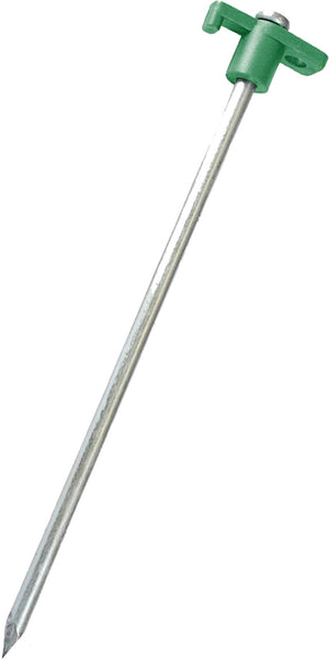 Tent Pegs Stakes T-Top Rubber Top with Heavy Duty Steel Nails 10'' Long - Besides doing a great job at keeping your tent where you put it, these heavy-duty tent stake t top pegs have multiple uses around home and backyard. Whether its to anchor canopies, gazebos or other temporary shelters, as landscaping stakes and just about anything else you want to stay put on the ground during picnics, barbecues, camping trips, tailgating, Christmas decorations and more! . Rely on ones that will do the job. They have sharp edges so please handle with care. The best steel tent stake nail pegs with plastic top that offers an 8mm diameter. Pegs come attached to the steel tent stakes. Spike is .25'' long. Fits into grommets and secures them with the plastic green top stopper. Easy to remove. Make your camping trip complete because most tents dont come with these sharp stakes.