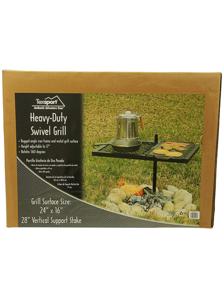 Heavy-Duty Swivel Grill. Welded of high quality steel to go over any campfire. 24 x 16 grilling surface with 28 vertical support stake. Height adjustable to 17 for optimal heat. Rotates 360 degrees to protect from heat and flames. Display box.
