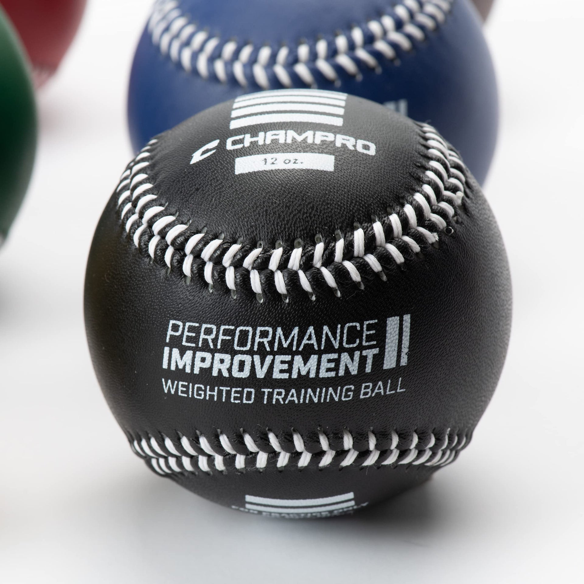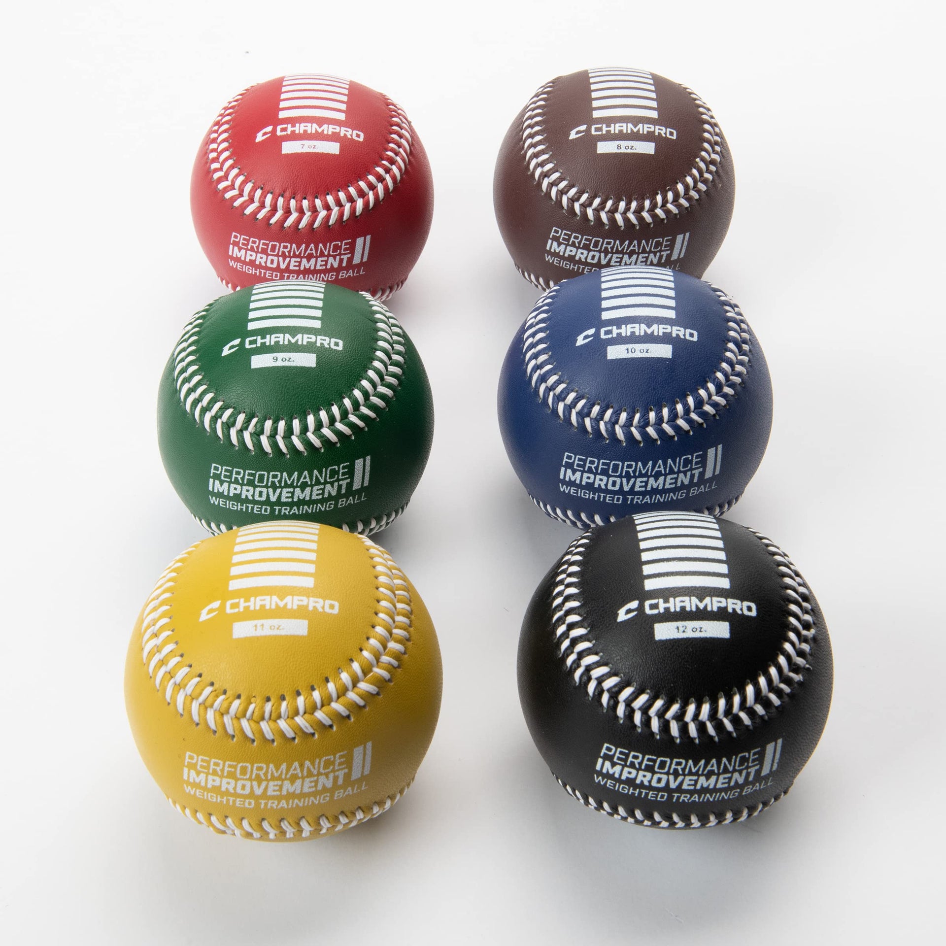 The CHAMPRO Weighted Baseball Training Set provides a way for players to improve their in-game performance. Many players agree that weight variation training can increase their velocity when playing with a regulation game ball. Train with the progressively heavier balls in this set to work on building arm strength and throwing velocity. CHAMPROs weighted training baseballs have stripe patterns that allow pitchers to monitor the pitch rotation, helping them develop their skill set. These balls have raised seams and leather covers that are made to last. The set comes with 6 progressively heavier balls--one 7, 8, 9, 10, 11, and 12 oz ball.