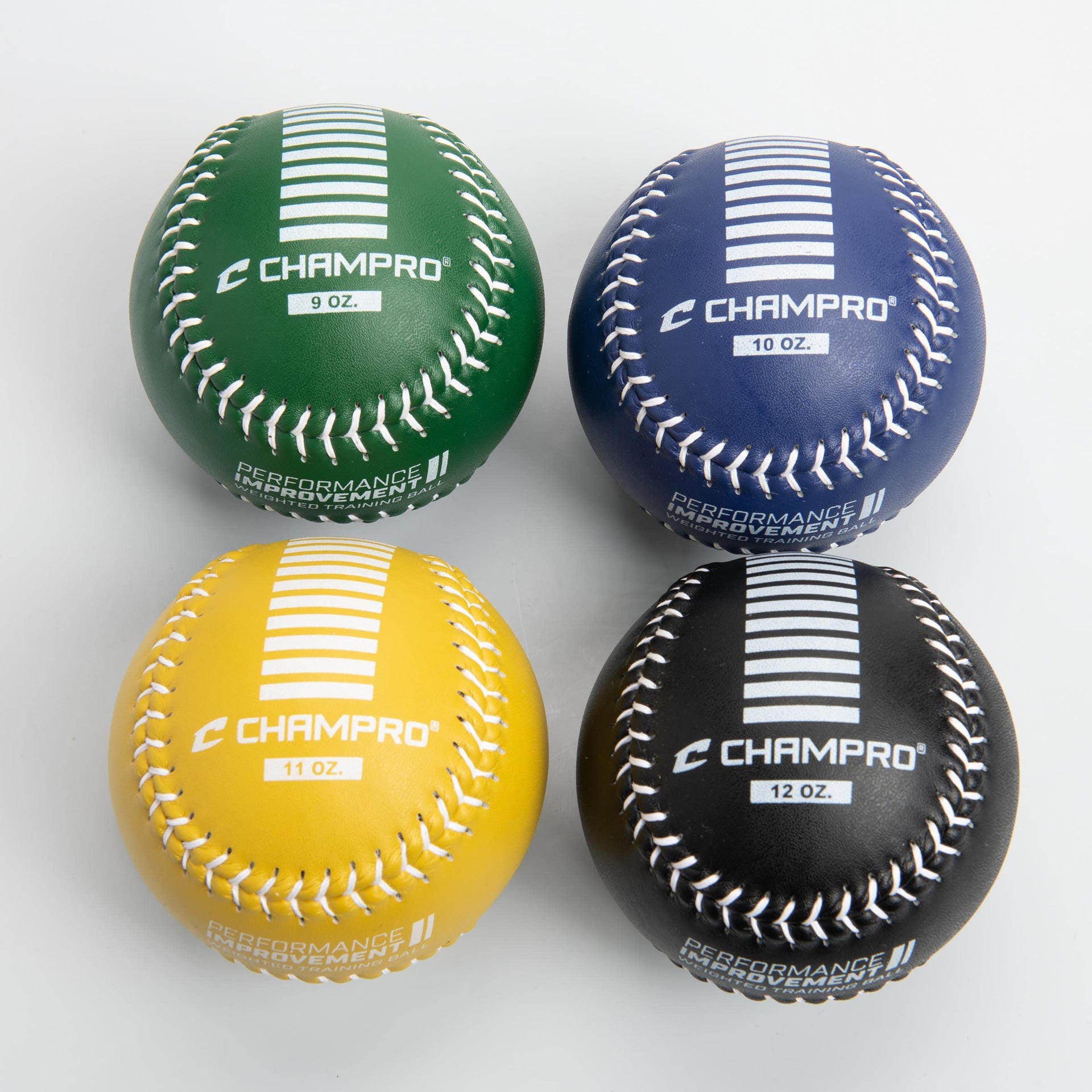 The CHAMPRO Weighted Softball Training Set is a set of 4 training softballs with full grain leather covers and raised seams and comes with a training program. The Concept: Conditioning with weighted balls has been referred to as Overload Training. Many players agree that training with weighted balls can improve their velocity when playing with a regulation game ball. As with other types of weight training the strength of his or her arm by training with progressively heavier balls. Each set contains 1 each: 9 oz, 10 oz, 11 oz, 12 oz.Warning: Weighted training balls are intended to be used with caution in a supervised muscle development program. As with any physical activity injuries may occur. Even when used properly is a certain degree of risk. Weighted balls should not be hit with a bat or thrown to another player. They should only be thrown into screens or used for stretching exercises. The manufacturer can assume no responsibility for injuries resulting from the use of weighted training balls.