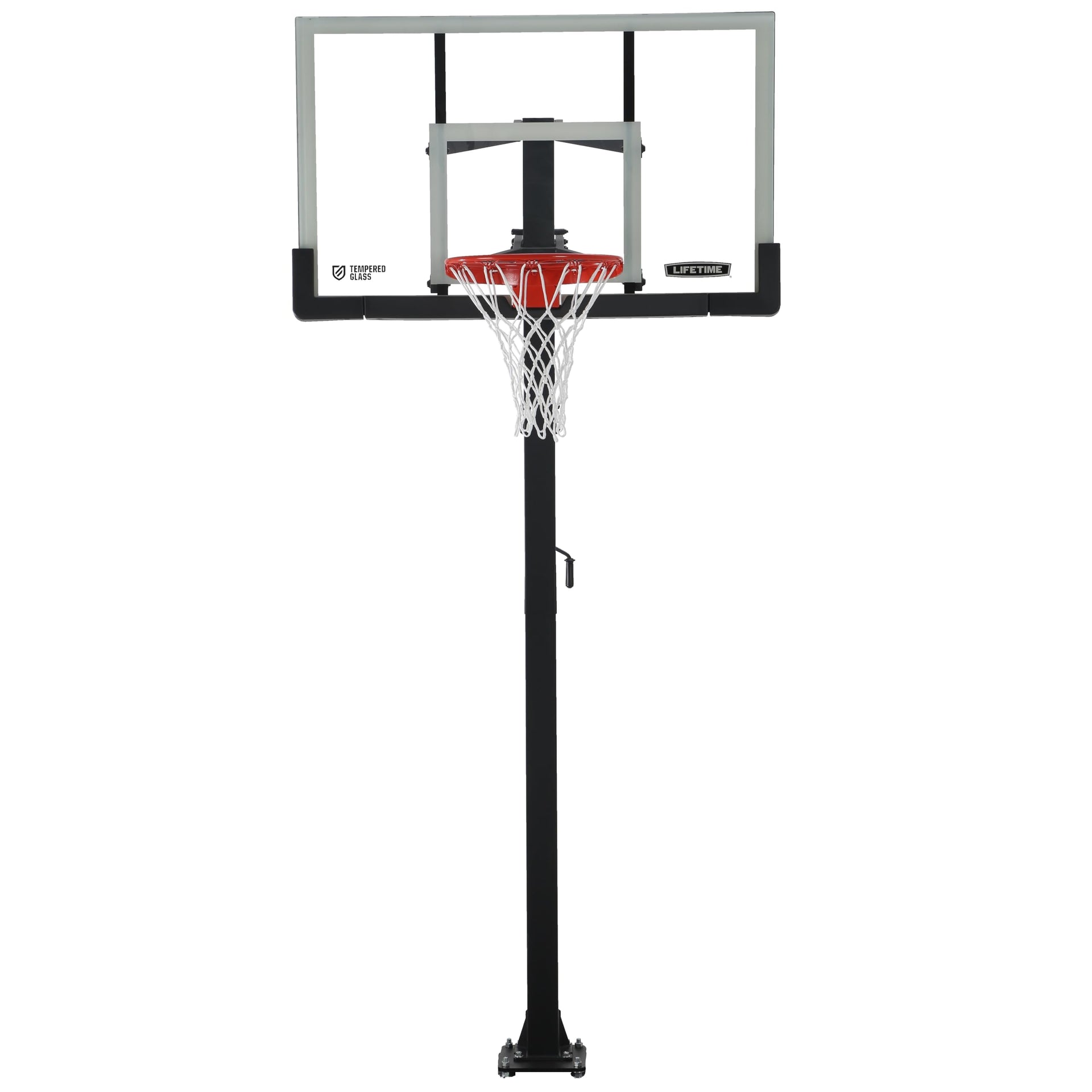 This system has a 4 in. hard square pole that bolts down and comes with a two (2) piece pole, Crank Adjust, 6 mm tempered glass backboard, Slam-It Ultra rim, and a max backboard offset of 28.5 in. This system comes with corner guards and is packaged in one box. 5-Year Limited Warranty. Feature Points