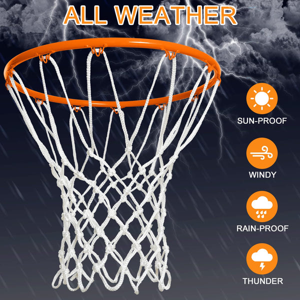 When the net starts to wear or breaked,which is hard to make a basket or layup.To ensure that you can fully enjoy the game of basketball, you need to keep the basketball rack in good condition.Whether you want to replace your basketball nets in indoor,backyard or public place or not,the all-weather basketball nets are can easily complete this goal! Basketball Net Points: ?12 loops to fit all standard indoor and outdoor sized basketball rims ?Prevent whipping without winding ?Official size:21 inches Material:Polyester + inner core Color:white Size:21 inches in length Package Includes: We have a combination of 1,6 or 12 basketball nets for your choice.