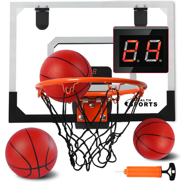 Product Description: Amazing over-the-door basketball hoop with automatic electronic scoring - 165x 125 indoor mini basketball hoop with 3 balls set for kids Play like a pro give every player an authentic basketball experience Just hang the mini basketball hoop on the door in your home, dorm, or office to have the fun and function of an official scaled down basketball hoop in seconds Basketball Accessories Include: Mini Hoop basketball system (165 X 125 inch Board*1, 9 inch diameter Basket*1, Ball Net*1, Scoring Board*1Shim*1 Pothook*2, Wrench *1, Screws and Bolts) 63 inch mini basketball *3 Inflator*1 Warming Tips: children dont hang on the basket hoop DonAt hang something heavy on the basket hoop and do not pull the basket hard to avoid the basket is deformed guarantee: If you have any question during you use it feel free to contact us We will try our best to help you