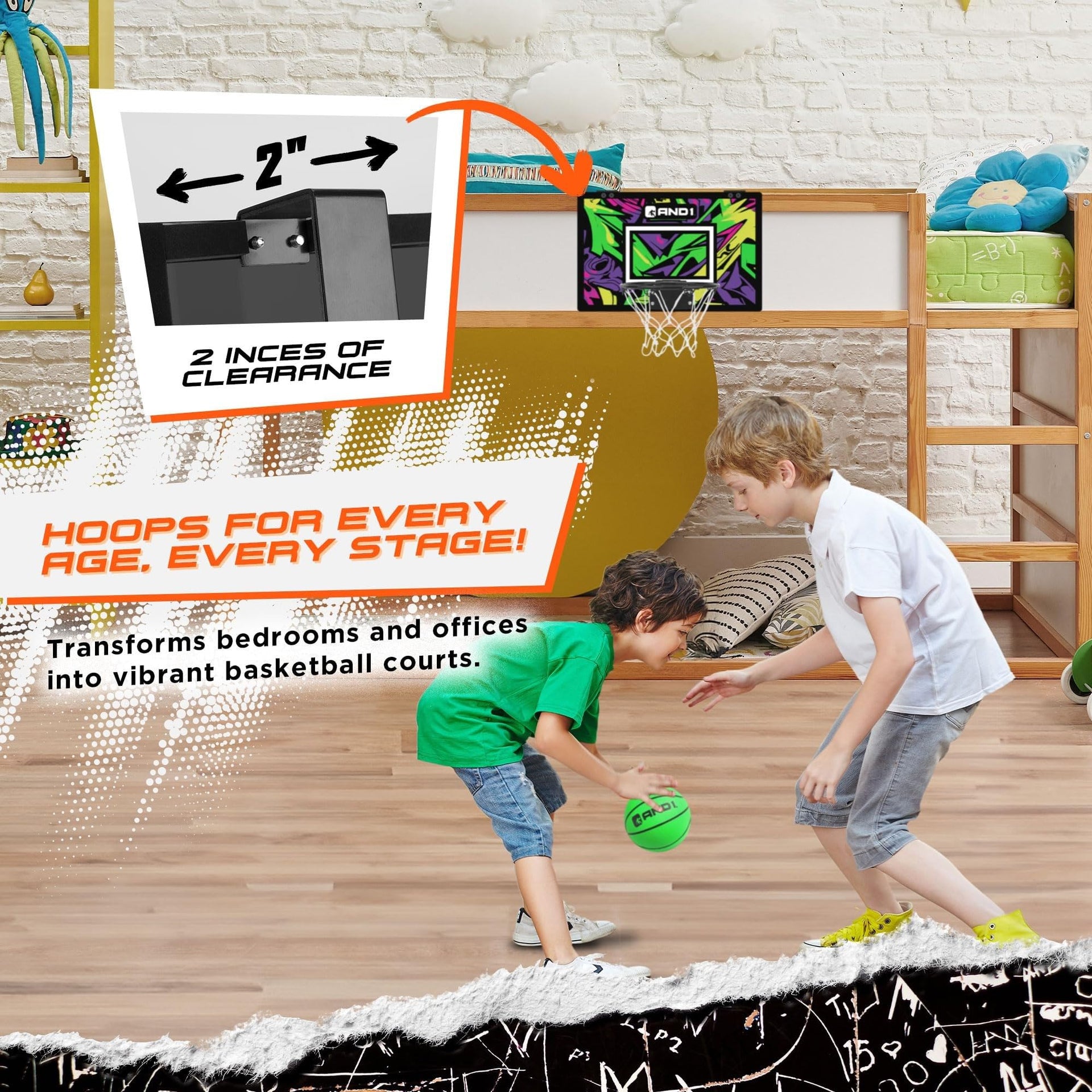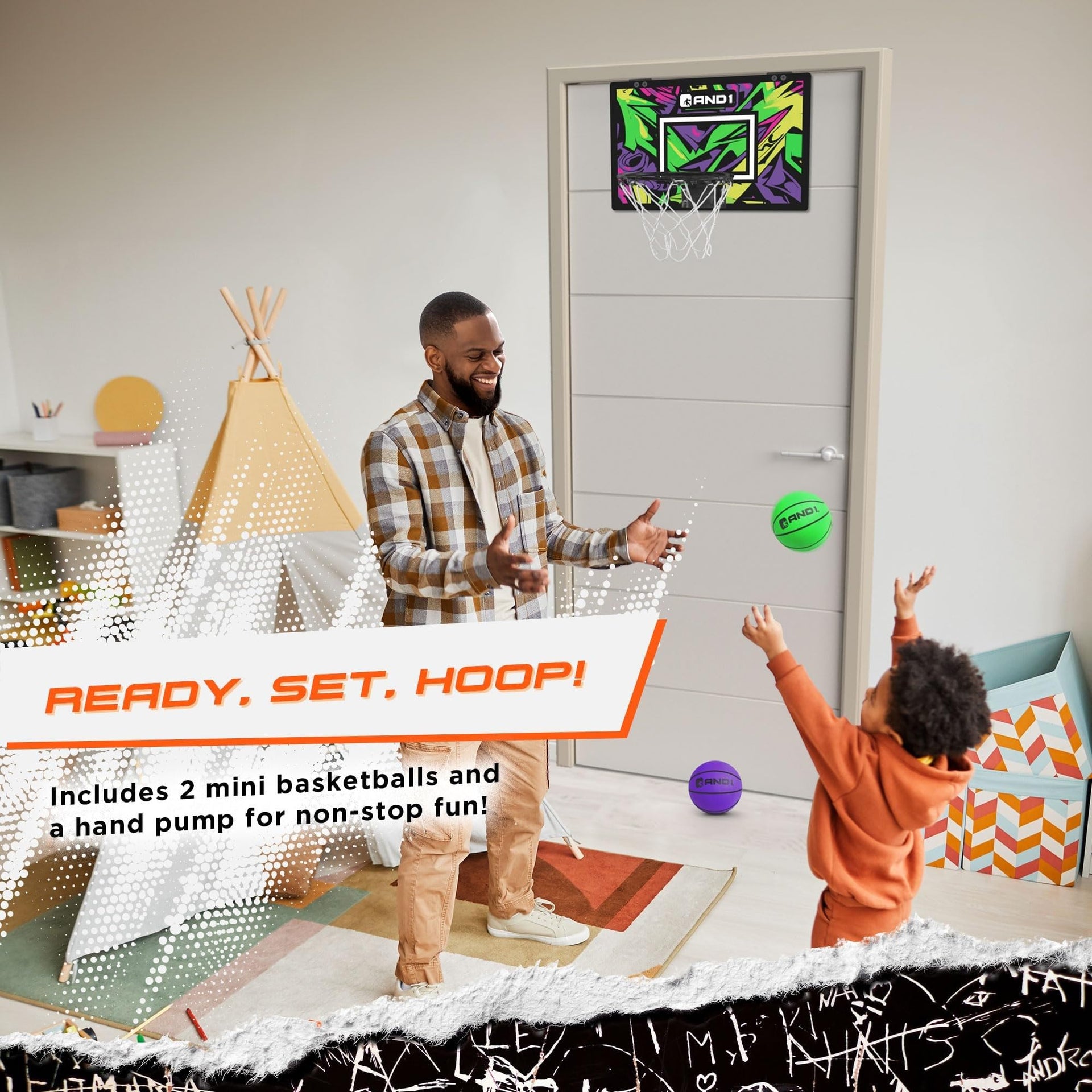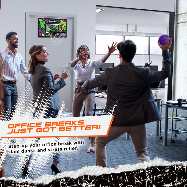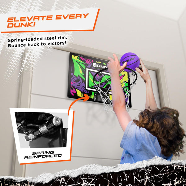 EXPERIENCE INSTANT BASKETBALL FUN: Dive into the world of sports with the AND1 Over the Door Basketball Hoop, a perfect indoor basketball accessory. Unbox the excitement with a pre-assembled, no-tools-required design, making it an ideal mini basketball hoop for both kids and adults. | ELEVATE YOUR GAME WITH PROFESSIONAL FEATURES: Take your indoor basketball experience to new heights with the AND1 Over Door Basketball Hoop. Enjoy a 9