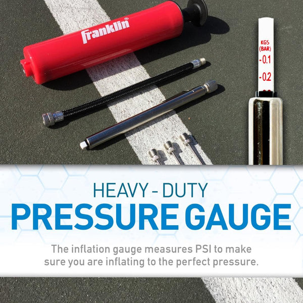 Keep your sports balls inflated and ready to play with Franklin Sports Ball Pump Kit Nothing is worse than a flat basketball or soccer ball when youre ready to get the game started But with this complete hand pump kit, youll have everything you need to keep your sports balls inflated for optimal play This set comes complete with (1) 75 hand pump, (3) inflation needles (1) flexible hose, (1) air pressure gauge, and (1) carry bag to make it easy to bring on the go Dont let your game fall flat Bring home one of Franklin Sports Ball Pump Kits today and bring the bounce back