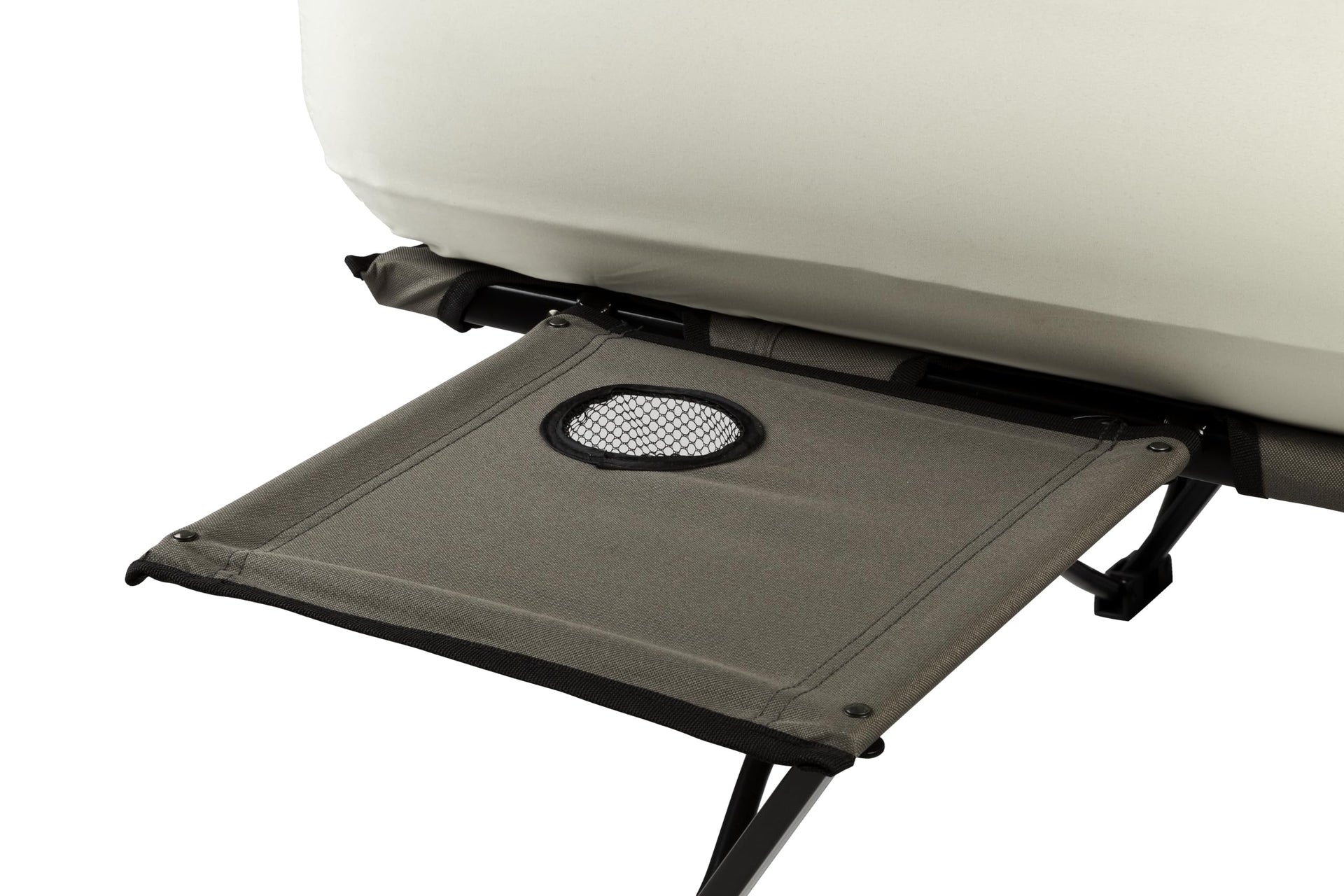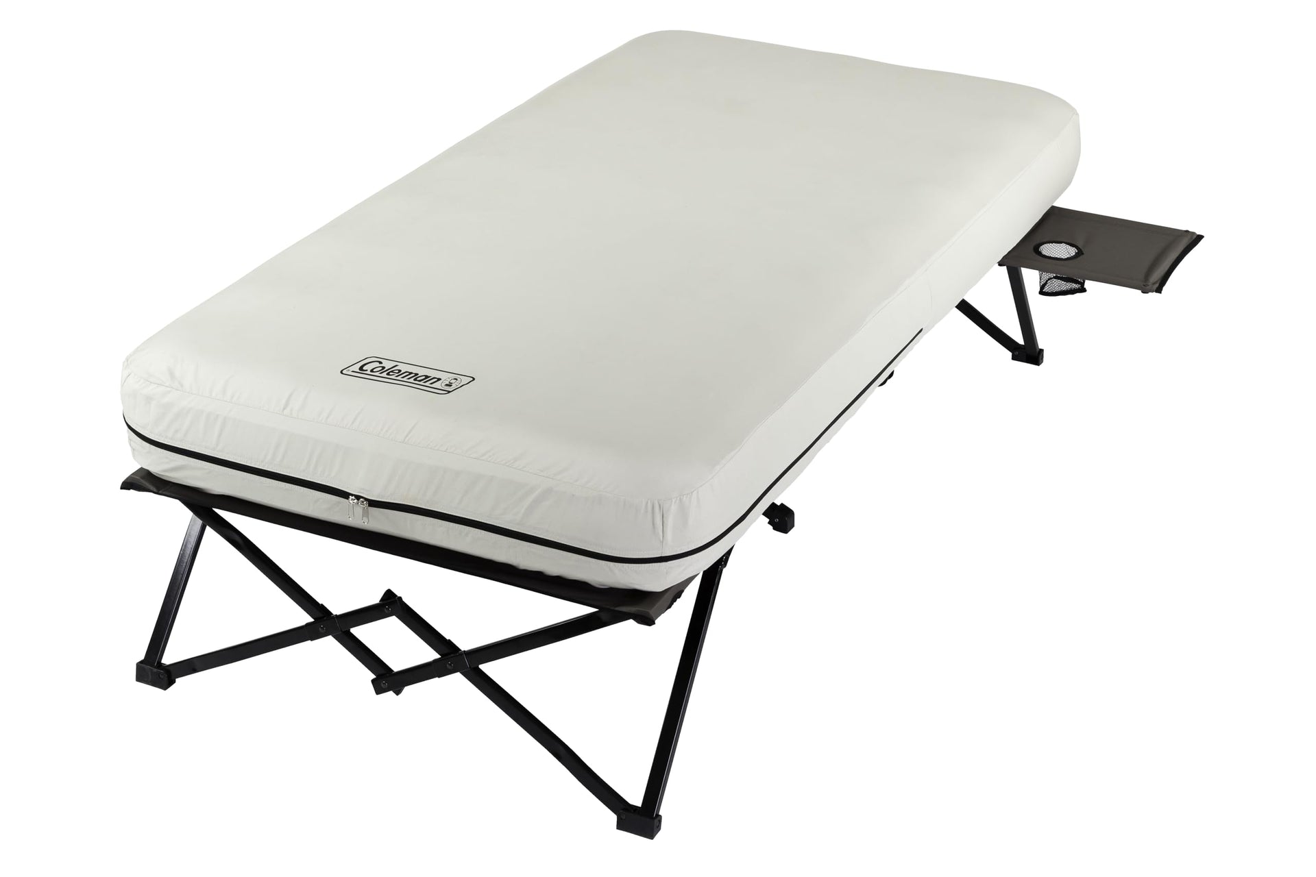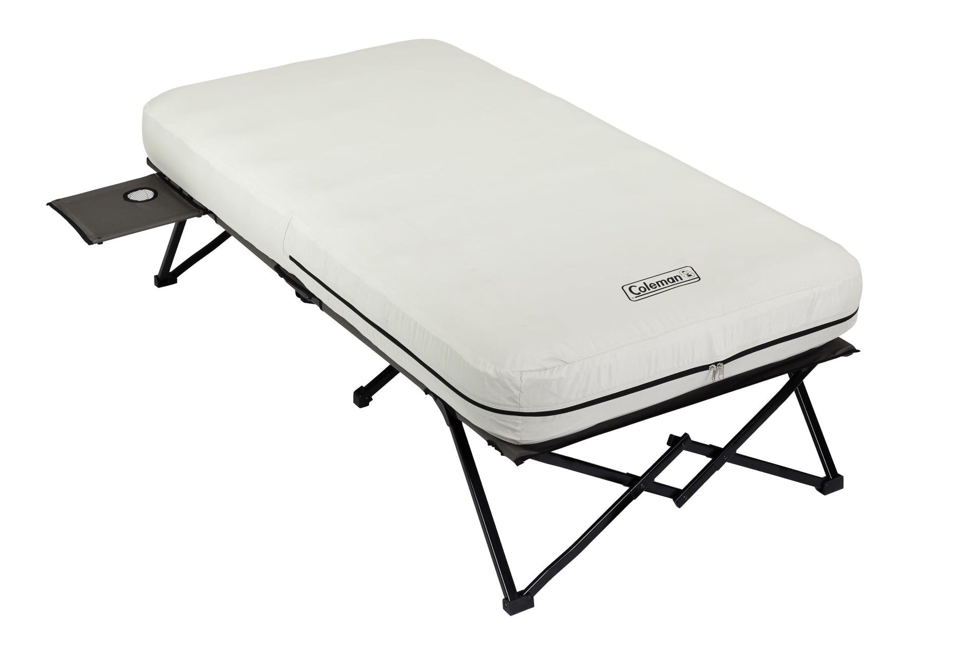 Ideal for both indoor and outdoor use, the Coleman Twin Airbed Folding Cot is a perfect sleeping solution for camping, glamping, or accommodating guests. It deftly combines a comfortable twin air mattress with a robust, portable folding cot, offering elevated restful sleep whether at a beach, backyard, or in a festival tent. The airbed's ComfortStrong coil construction offers support and minimizes bulging for a rejuvenating rest while its factory-tested AirTight system and Double Lock valve keep the mattress at an optimal firmness level. Quick to inflate with a 4D battery pump, its durable steel cot frame accommodates most people and can bear up to 300 pounds. The side table with an integrated cup holder is a handy addition, keeping your drinks and personal items within reach. Lightweight and compact, its folding design and carry bag make packing, transporting, and storing a breeze.