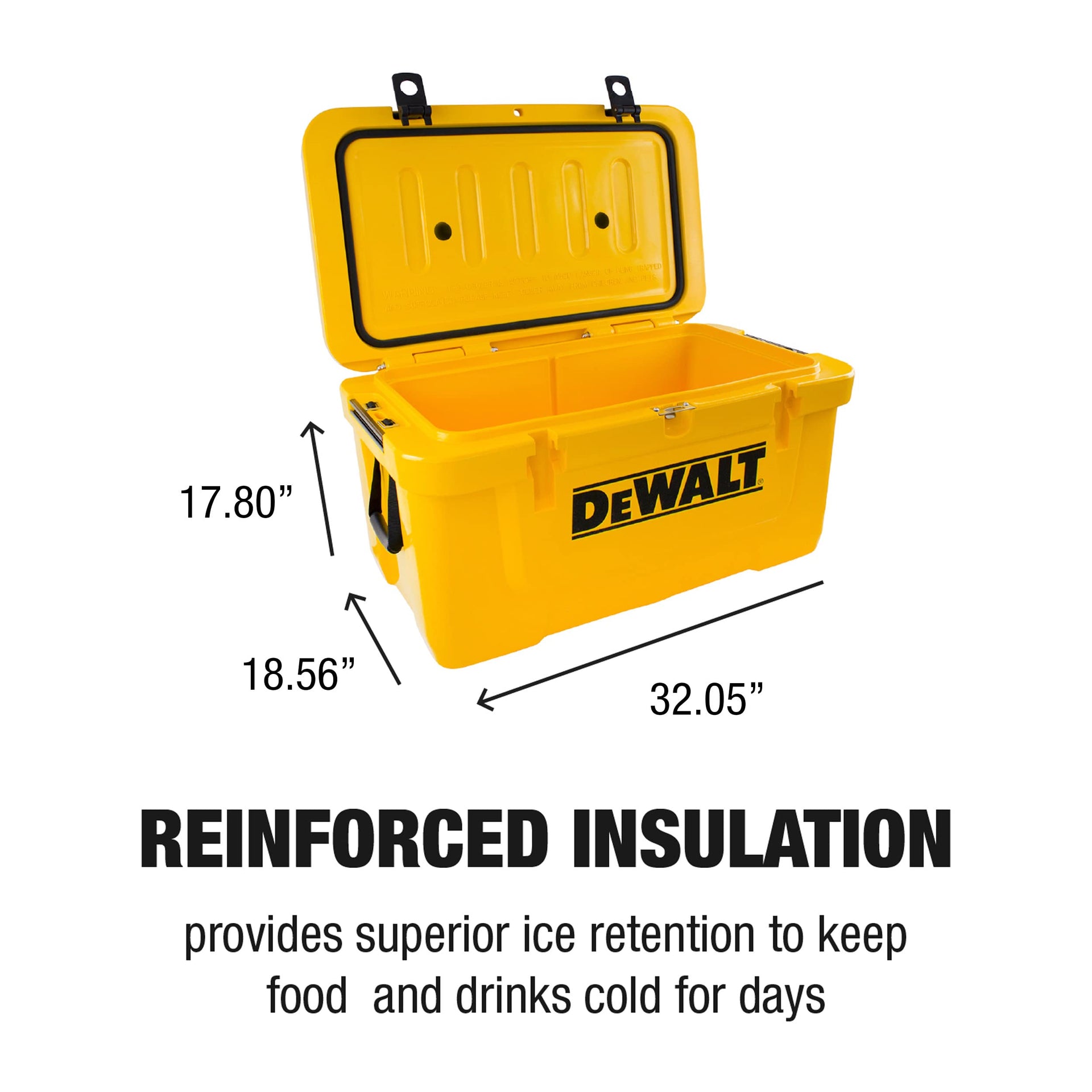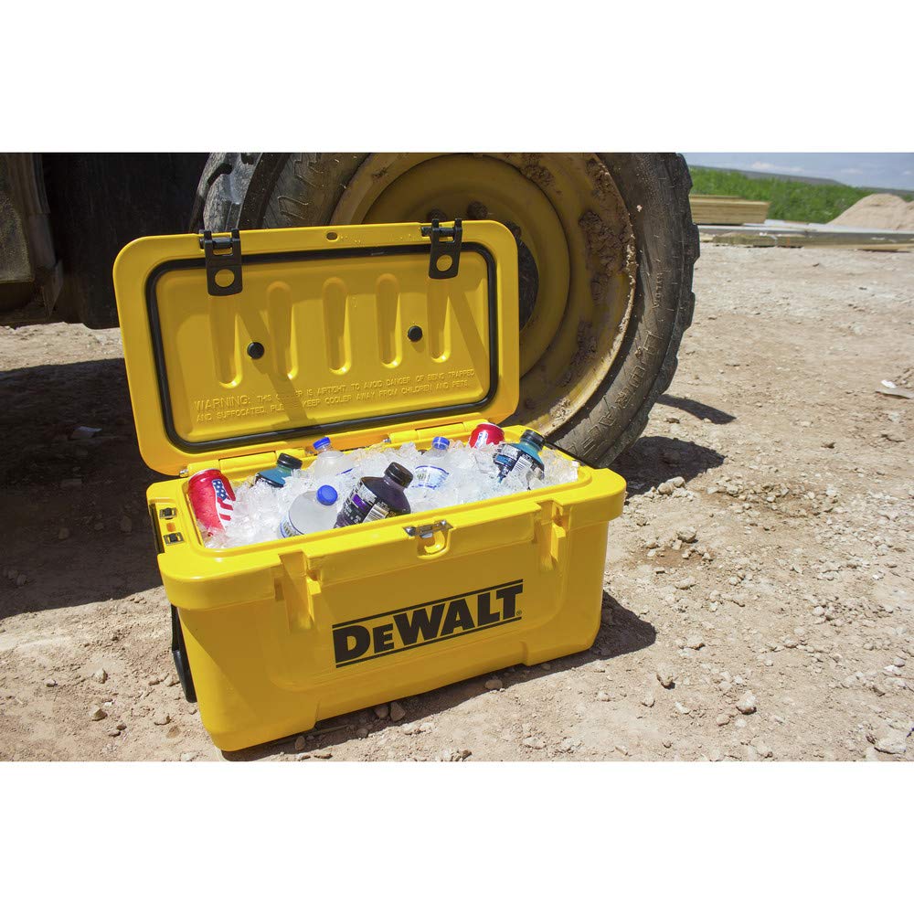 The 65 Quart Cooler is the perfect tool for keeping food and beverages cold for days.The roto-mold design is durable and will stand up to the roughest treatment. The strong exterior construction reduces the amount of stress typically put on a cooler during everyday use. The reinforced pressure-injected insulation provides superior ice retention and ensures temperature optimization in the heat. Keep your drinks and food colder longer with the DEWALT 65 Quart Cooler.