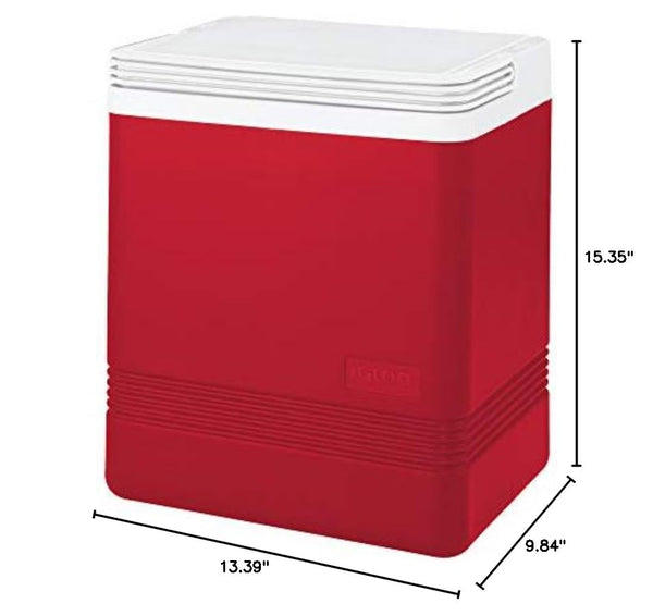 Product DescriptionIgloo Legend Cooler (24-Can Capacity, Red)Whether it's a jam-packed stadium or a quiet bend on a river, carry cold drinks and food with you anywhere. 17-quart capacity can hold up to 24 soda cans, and can even hold 2 liter bottles upright. Removable lid flips over, revealing unbelievably convenient tray and cup holder. Swing-up handle makes for easy carrying, and folds flat for easy stacking. Keep your hydration cold wherever you go with a compact, personal cooler.From the ManufacturerIgloo