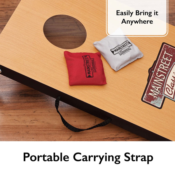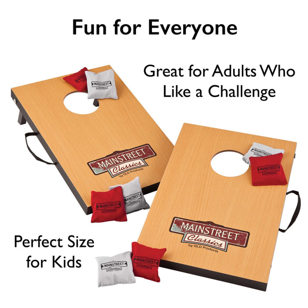 If you're wondering what happened to good old-fashioned fun, look no further than the Mainstreet Classics Micro Bag Toss. A new twist on a simple tradition, this bean bag toss is loads of fun for all ages. Use it at graduation parties, or retirement parties, dinner parties - anywhere the mood for a little friendly competition may strike. The rules are simple, the bags are small, but the fun is huge. Complete with two boxes and eight bean bags. The mini game set features two portable bean bag tossing targets. The smaller target size makes for more difficult play for adults and is also a great size for children. The set includes eight durable bean bags, attached carrying handles, and foldable legs for easy storage and portability. Each base station dimensions: 15-3/4'' L x 10-1/2'' W x 2-1/2'' D.