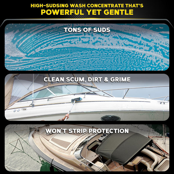 Meguiar's M43 Marine/RV Boat Wash safely removes grime and dirt without stripping wax protection. Our non-streaking formula brightens your boat's surface with rich conditioners and leaves a dazzling finish. The long-lasting sudsing action makes washing your boat or RV easier than ever. No need to frequently add water to rejuvenate your suds! (1) Title draft language created by generative AI and reviewed, edited, and revised by Meguiars.
