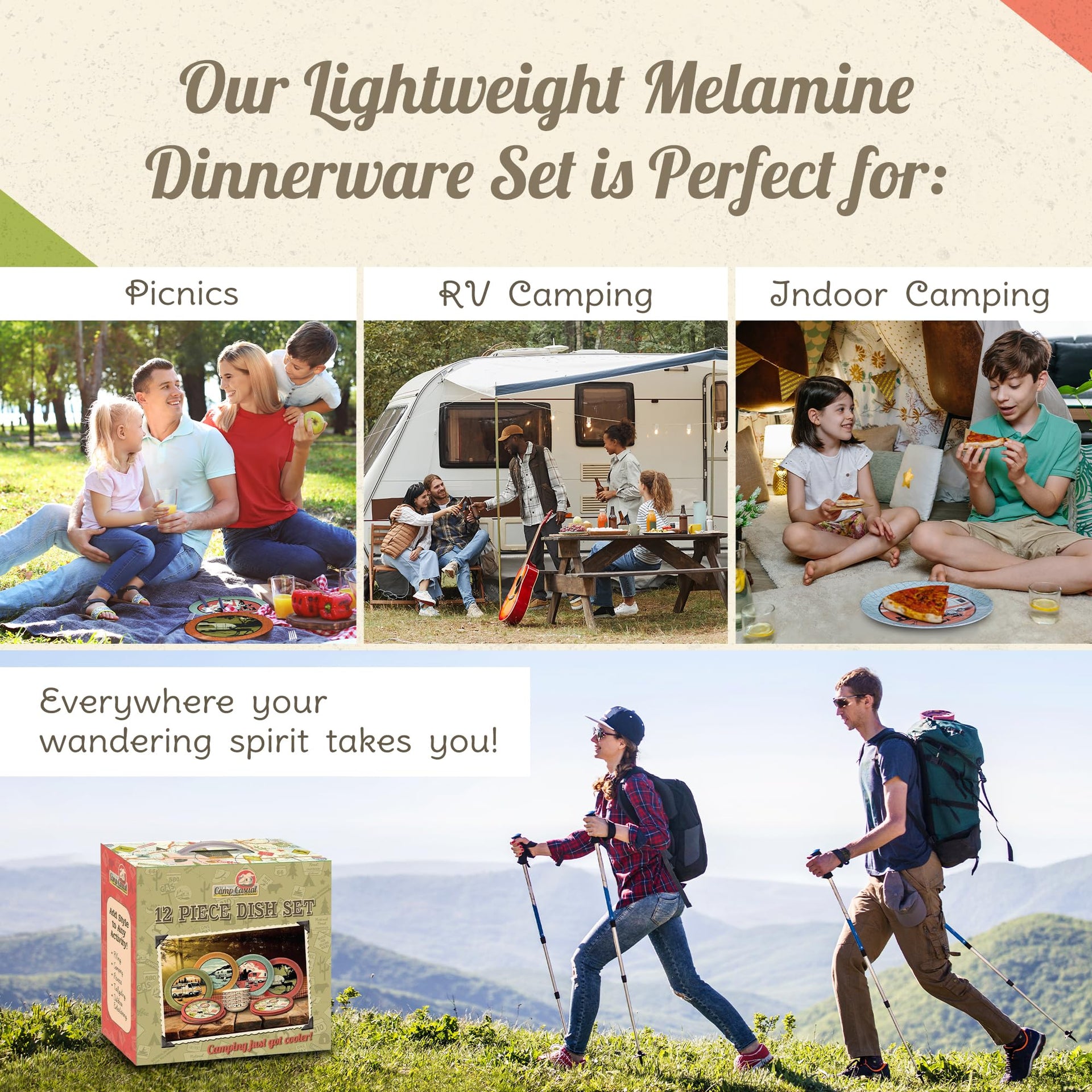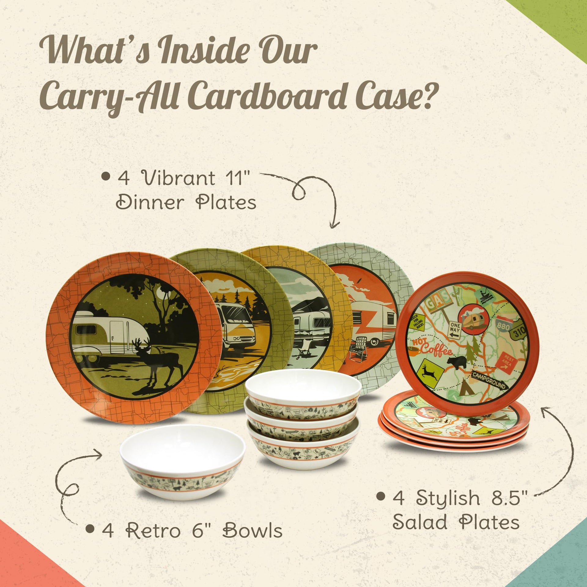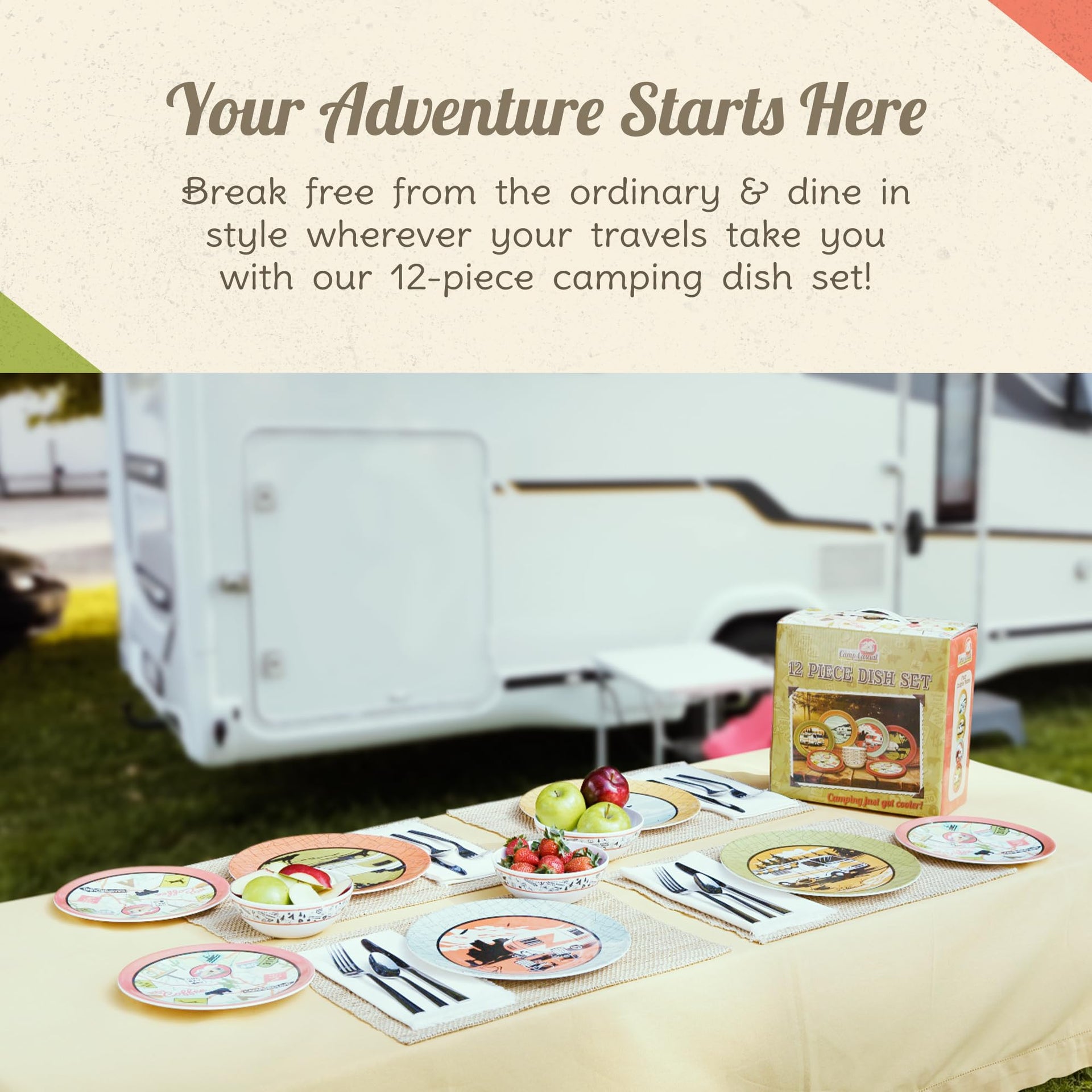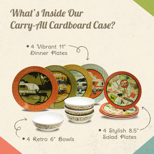 Elevate Your Camping and RVing Experience with the Camp Casual 12-Piece Camping Plates Our melamine dinnerware sets are a great addition to your camping and RVing gear. This melamine dinnerware set stands out with its unique design, adding a touch of style and sophistication to your outdoor adventures. Crafted with meticulous attention to detail, each piece showcases retro-camping-inspired patterns that set it apart from conventional camping gear. Not limited to outdoor use alone, these versatile dishes set for 12 seamlessly transition from the great outdoors to your backyard or indoor settings. Whether planning an adventurous hike, organizing a backyard barbecue, or hosting a cozy indoor gathering, our camping dishes adapt effortlessly to any indoor or outdoor setting. Functionality takes center stage with the 12-piece Dish Set. While it exudes charm and style, this melamine dinnerware set doesn't compromise on practicality. Our dinner plates set of 12 is thoughtfully designed to enhance your camping or RVing experience. Its sturdy construction ensures long-lasting performance, while the stackable design saves valuable storage space. Whether enjoying a hearty meal or a quick snack, these dishes provide the perfect balance of functionality and aesthetic appeal. This camping dish set is more than just a collection of dishes; it's an invitation to create unforgettable moments of adventure. The unique design and exceptional quality of this melamine plate set evoke a sense of wanderlust and inspire cherished memories that will last a lifetime.
