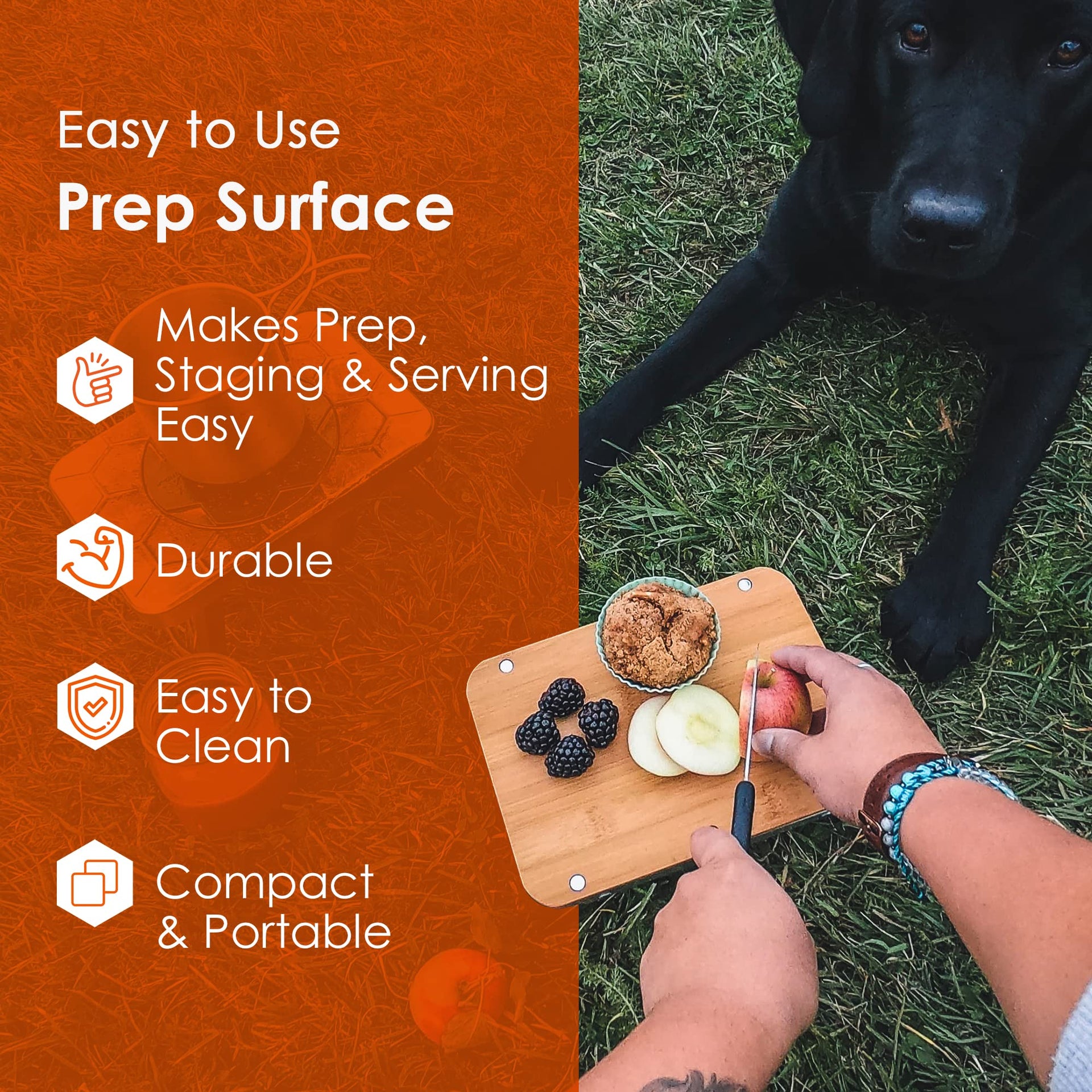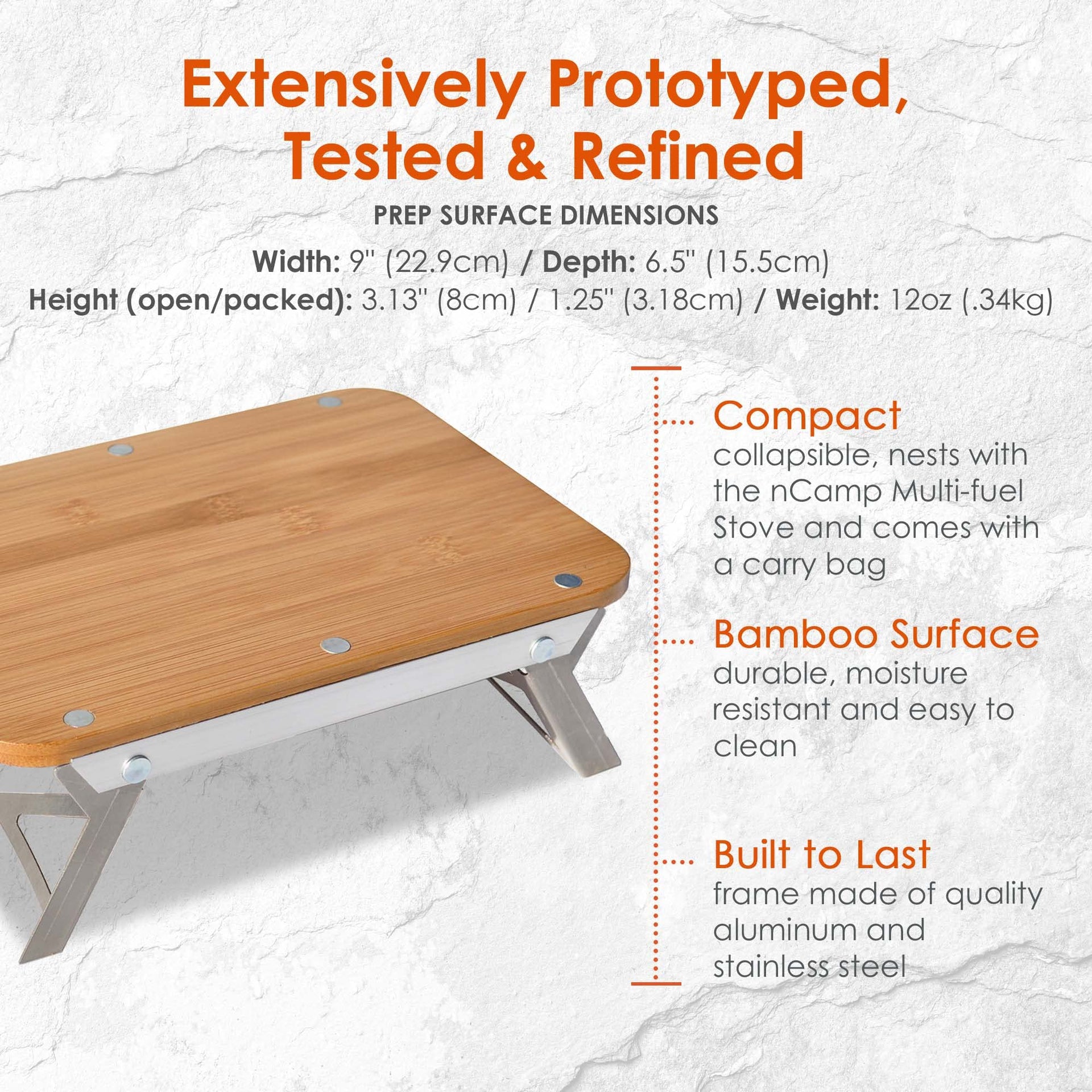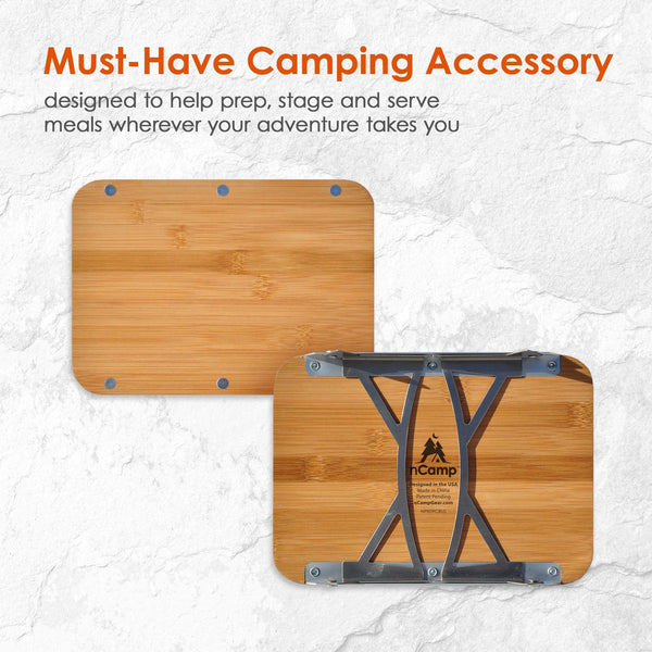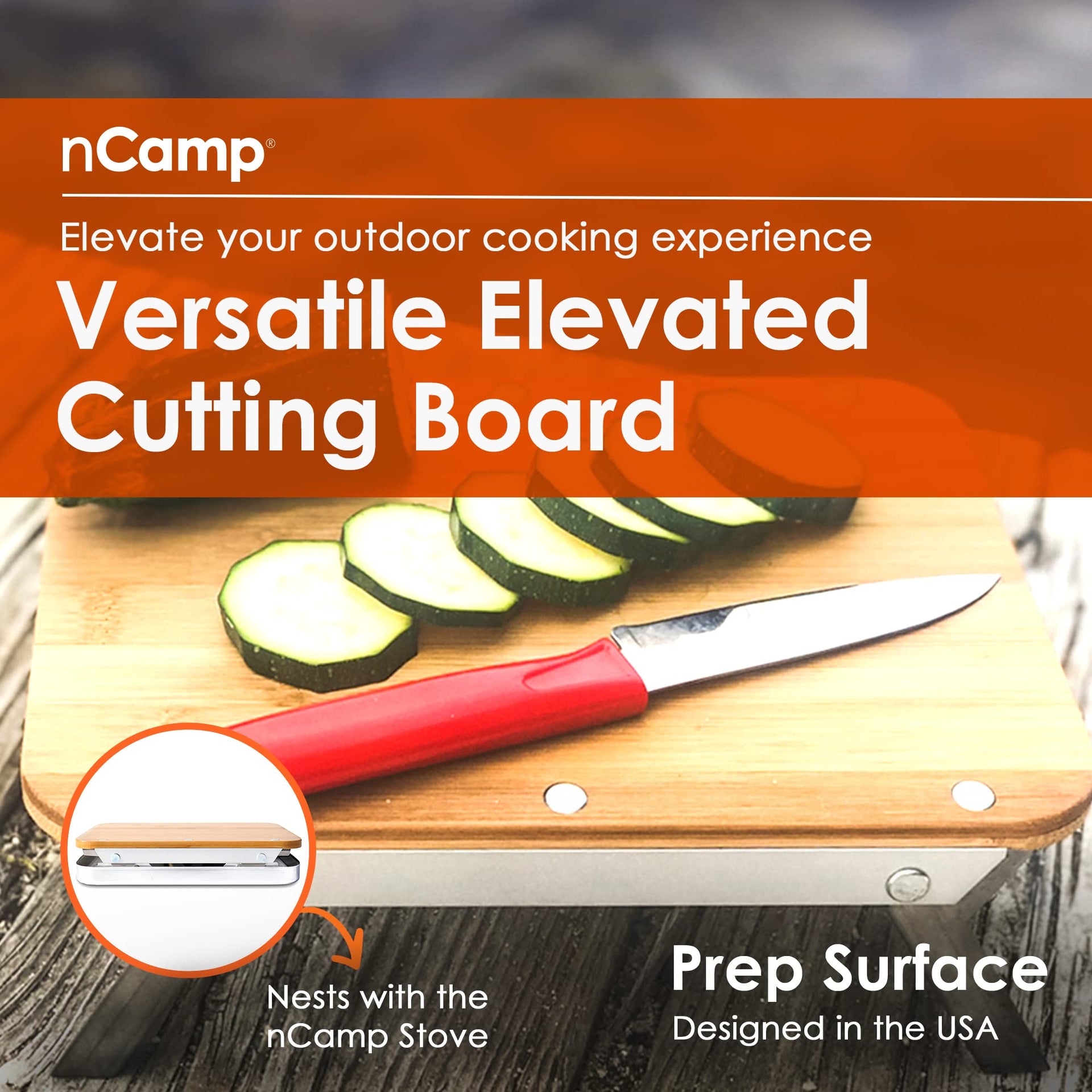 Take your kitchen on the go with the nCamp Universal Portable Outdoor Camping Elevated Prep Cutting Board Surface. This camping cutting board is perfect for any situation such as camping, hiking, backpacking, and more. The lightweight elevated work surface gives you a clean place to prepare all your meals when in the wilderness. It provides you with almost 57-square inches of easy to clean horizontal work space for clean cuts. The bamboo top is a superior natural cutting surface. This package also includes a carrying bag making it easy to take on the go and store. Don't let the great outdoors stop you from cooking the food you want. Enjoy the best of both worlds with the nCamp Universal Portable Outdoor Camping Elevated Prep Cutting Board Surface. This product does not protect users or others against food-borne bacteria. Always clean and wash this product thoroughly before and after each use.