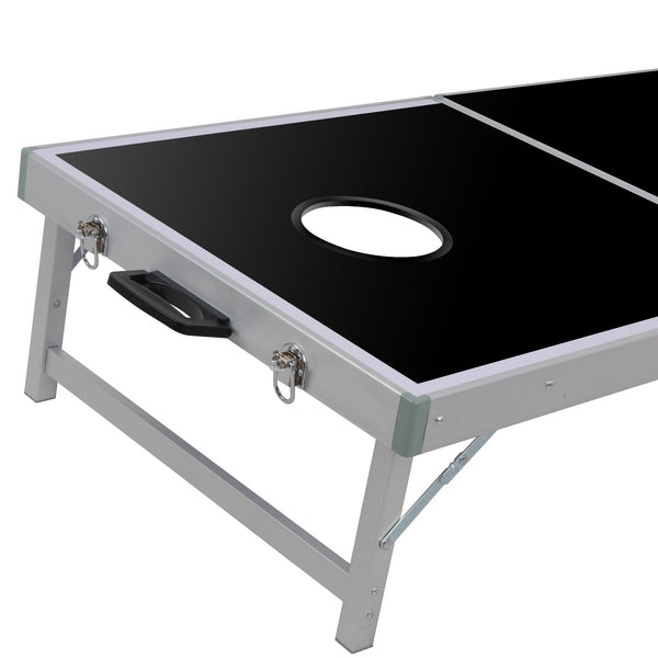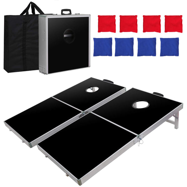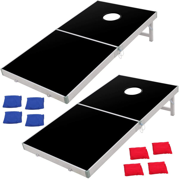 This portable set of 2 bean bag toss platforms and bags comes with everything you need for fun at your next tailgate or outdoor party! The portable waterproof, UV-resistant platforms fold up to a height of 11.02 each, and can fold back down for easy transport-simply use the attached carrying handles and youre good to go! Fun with family and friends is a toss away with the Corn Hole Bean Bag Toss Set FEATURES: This toss bag set comes with (2) platforms, (8) bean bags,Includes (4) red and (4) blue bean bags UV-resistant and waterproof platforms Platforms fold and lock into place Built with carrying handles, includes carrying bag DIMENSIONS: Overall Dimensions: 35.43 (L)x 23.62 (W) x 11.02 (H) Folded Dimensions: 35.43 (L)x 23.62 (W) x 4.13 (H) Bean Bag: 5 (L) x 5 (W) Corn Hole: 5.51 (Diameter) Platform Weight : 14.50 lbs Bean Bag Weight (Combined): 8 lbs SPECIFICATIONS: Color: Black Material: MDF, Polyester Recommended Age: 13+ years Choking Hazard: Bean Bags No assembly required