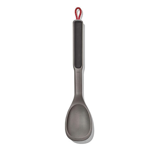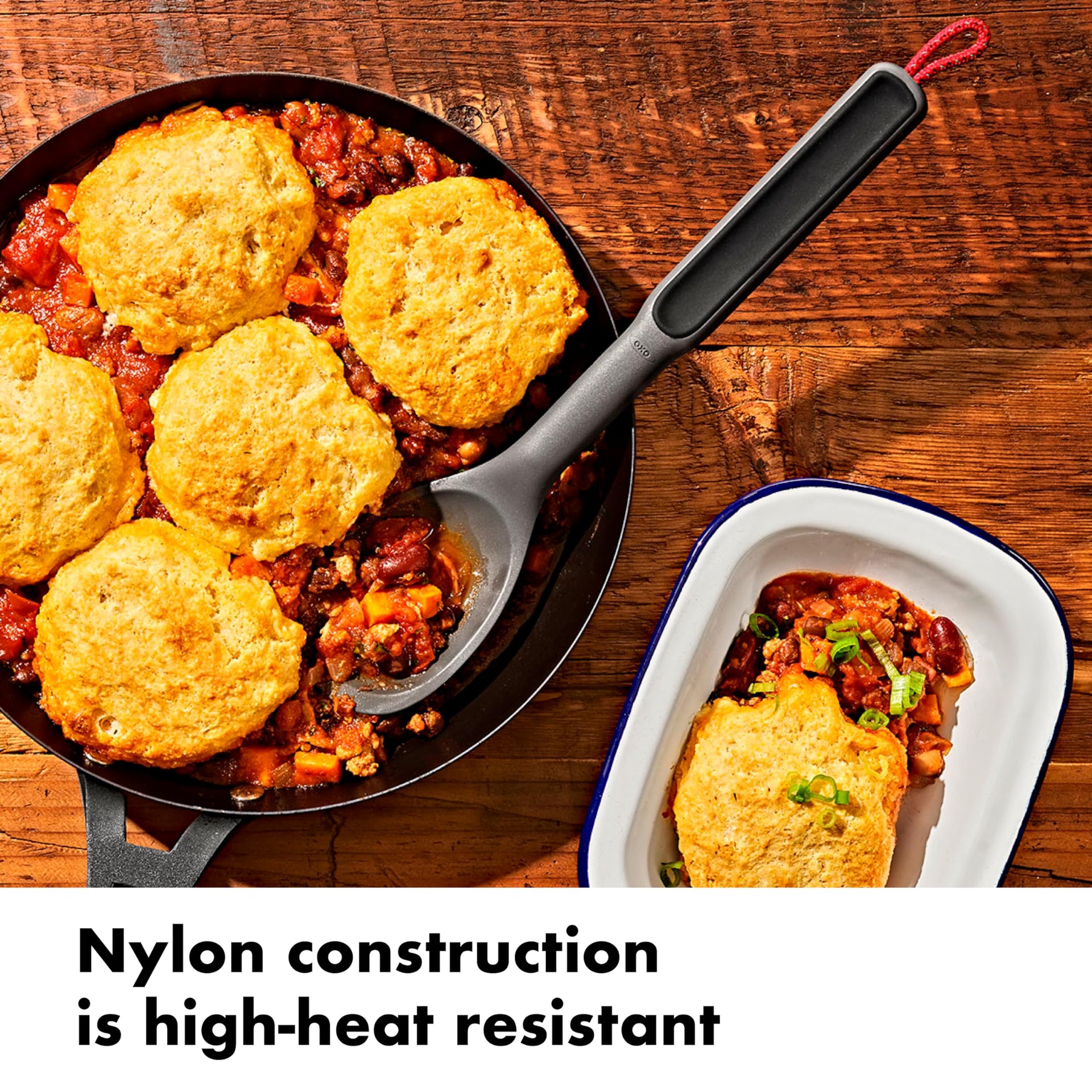 Designed for handling your outdoor grub, the OXO Outdoor Nylon Camp Stove Spoon can stir up a big pot of chili, serve piping hot oatmeal and more. The high-heat resistant, nylon head is safe to use on all types of cookware and the Spoons flexible edges have been designed to scrape up every last bit of food. The Spoon also has a non-slip handle for a secure grip (even if your hands are wet) and a reflective hanging loop (to help you spot it the in the dark). The Spoon is also designed to nest with other Nylon Camp Stove Utensils for compact storage. Dishwasher safe.