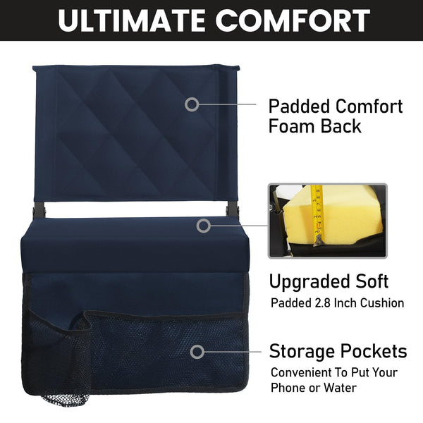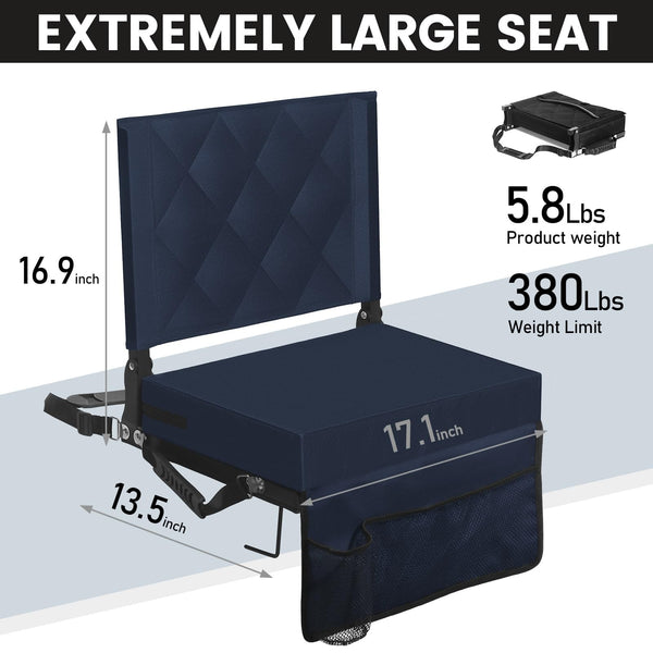 Are you tired of sitting on uncomfortable bleachers or benches while attending your local games or events? Do you need back support while relaxing in the sports events? If so, consider trying Sheenive stadium chairs for bleacher with back support Thick Soft Comfy Padding Our bleacher chair is designed with a 2.8 inch cushion providing a soft and exceptionally comfortable seat. Great Back Support 16.5 inch hight padded comfy foam back, provides superior back support compared to fabric. The back of our bleacher seat is well padded so you can rest assured back aches will be a thing of the past. Extra Wide Large Seat At 17.1 inches in width and 13.5 depth, our stadium chair is one of the widest on the market providing you with extra space and comfort. Bleacher Hooks and Non-Slip Rubber Strips No more worrying about your seat toppling off your bleacher when jumping to cheer for your team or for your kids. Our stadium seats with back support also come equipped with two steel bleacher hooks and non-slip rubber strips, so you can feel secure and stable while sitting Lightweight, Foldable, Portable. With a convenient carrying handle or shoulder strap, you can effortlessly take it with you wherever you go. Sheenive bleacher seats with backs and cushion come with a 30 day money back guarantee and a 1 year manufacturer's warranty.