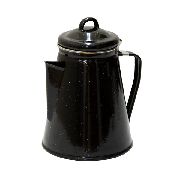 This Stansport Enamel Percolator Coffee Pot & 4 Mug Set is the perfect companion for outdoor adventures and cozy mornings at the cabin. This set features a baked enamel finish, ensuring long-lasting durability and resistance to wear and tear. The coffee pot and mugs are accented with a brilliant stainless-steel rim, adding a touch of elegance to their robust design. The percolator comes equipped with a stem and basket, allowing you to brew up to 8 cups of your favorite coffee with ease. The coffee pots practical design includes a pour spout, a side handle for a comfortable grip, and a hinge-attached lid for convenience. Each of the four mugs holds 12 oz. of liquid, making them ideal for sharing your morning brew with family and friends. An ideal accessory for the campsite, cabin, kitchen, hutting expeditions, tailgating, and more!