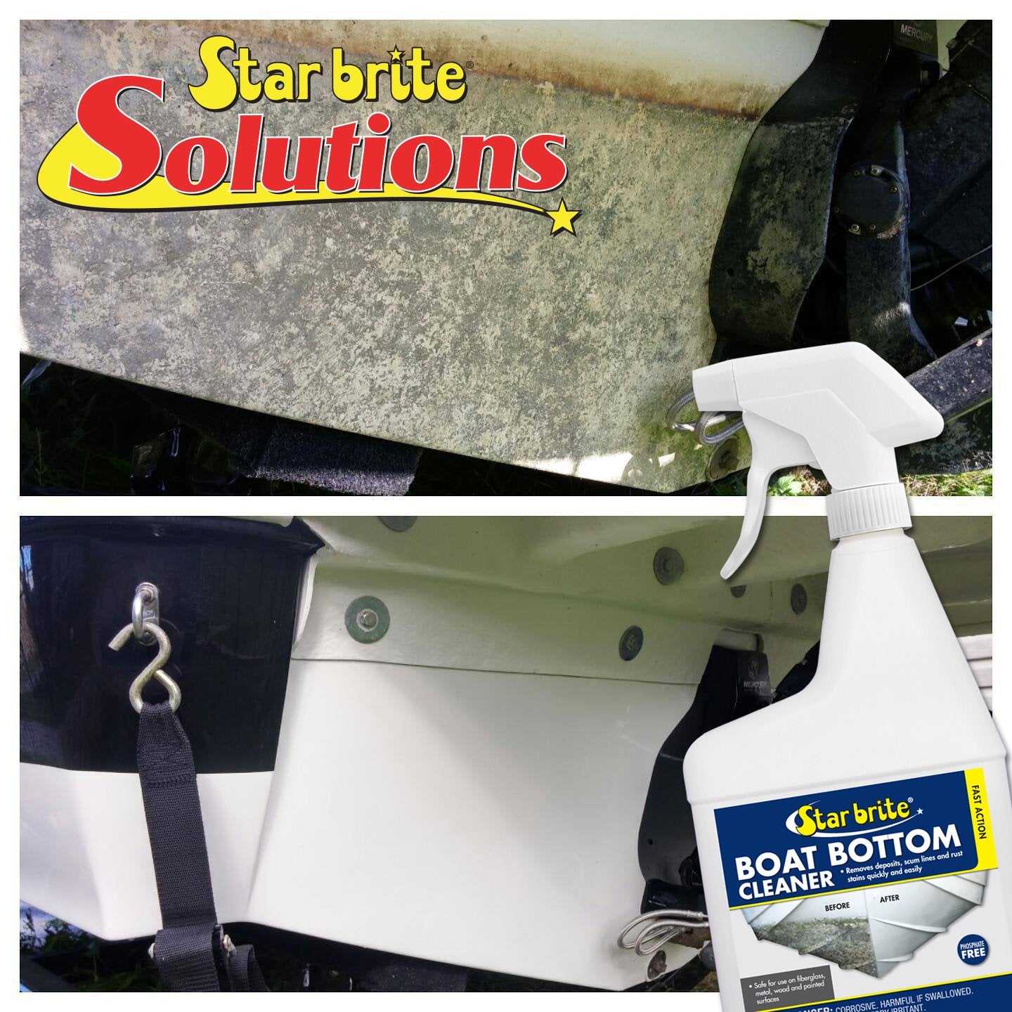 Star Brite Boat Bottom Cleaner is a must-have for every boat owner. Its acid-based formula is designed to tackle the toughest stains and grime, ensuring your boat's hull remains in pristine condition. With Star Brite, you can say goodbye to stubborn alkali water rings and yellow build-up that have been plaguing your boat for years. This powerful cleaner works effortlessly, eliminating the need for strenuous scraping or elbow grease. However, due to its potent formula, it's crucial to wear protective gear when using Star Brite Boat Bottom Cleaner. This product is very caustic and can cause skin irritation. Therefore, it's recommended to use specific cleaning devices and follow proper disposal practices to ensure safety. Star Brite Boat Bottom Cleaner - because your boat deserves nothing but the best. DIRECTIONS: Remove the boat from water. Allow deposits and stains to dry thoroughly. Stains and deposits found above the waterline may be removed while boat is in water. Apply product to the dry surface of hull using an all-plastic sprayer, non-nylon roller or brush. Keep deposits and stains wet and foaming with the product. Foaming indicates the product is removing the deposits. Reapply as needed to maintain foaming action. After 10 minutes of foaming action, most surfaces should be clean and ready for rinsing with water. Heavy deposits may require several applications and light scraping. If sprayer is used, pump fresh water through before storing.