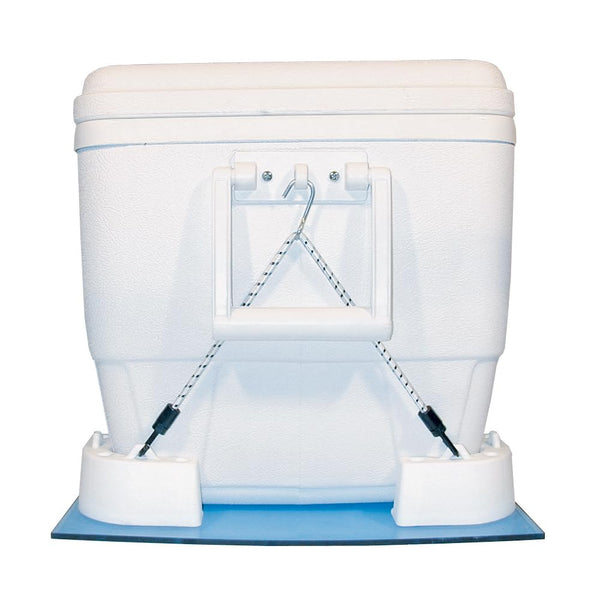 The Cooler Mounting Kit includes four corner brackets and two hold down straps. This kit will prevent cooler from moving around on the deck. The molded, UV resistant corner brackets have interior screw mounting holes to allow a flush mount against surfaces and to take up less deck space. The nylon bungee straps feature molded hooks and a stainless center hook for totally corrosion-proof mounting. Fits virtually all sizes and makes of coolers including Igloo. Straps provide secure mounting and are easy to disconnect.