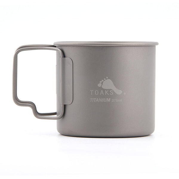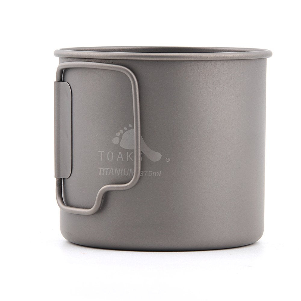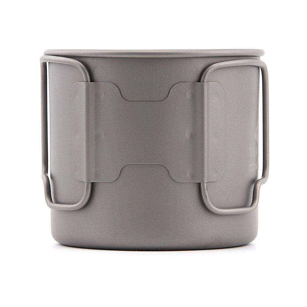 Titanium cup is light and strong, corrosion-resistant and lasts for years. Rounded bottom edges make cleaning easy and improves heating efficiency. Handles fold away for compact storage. Titanium leaves no metallic smell or taste. Comes with a mesh storage sack.
