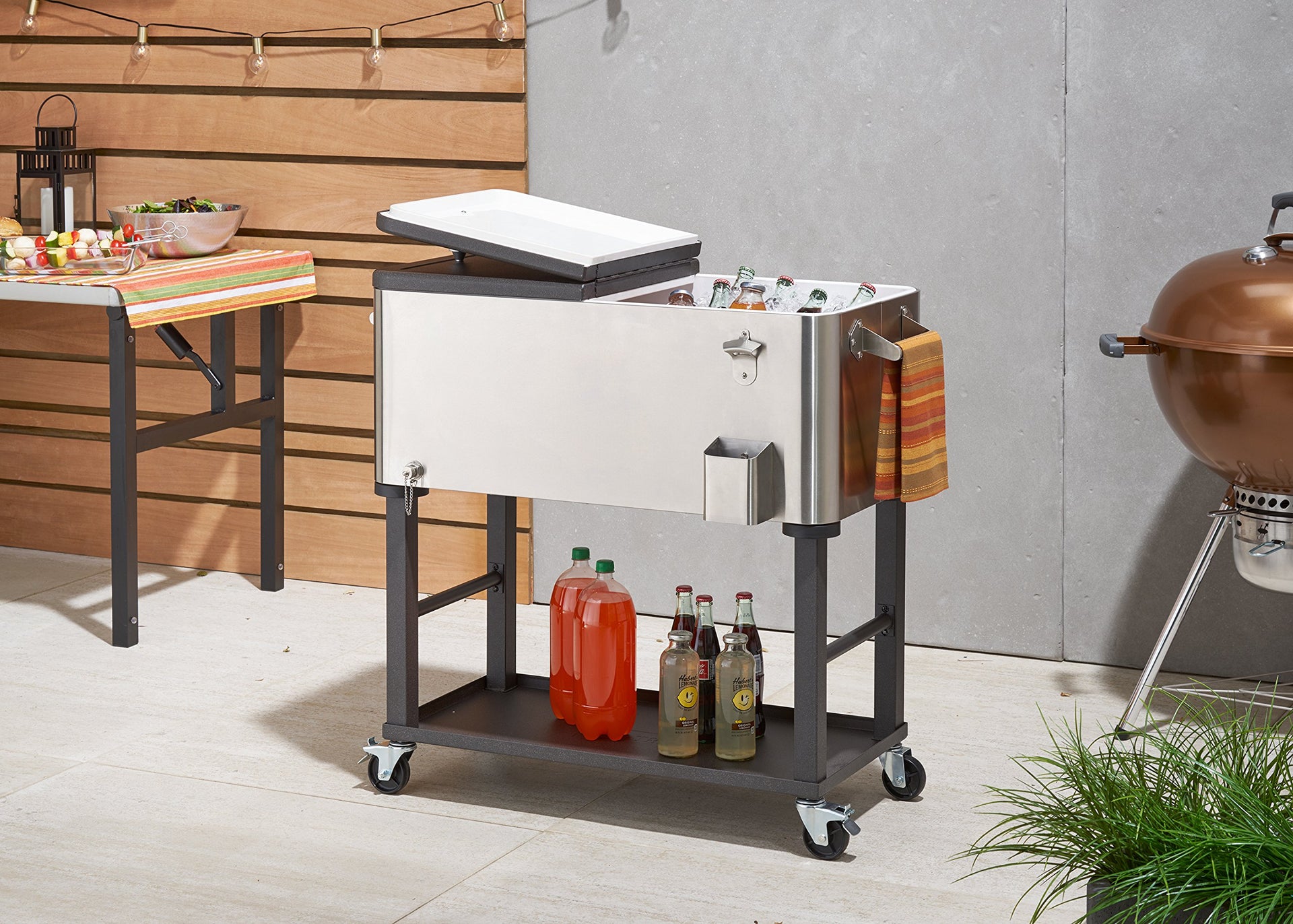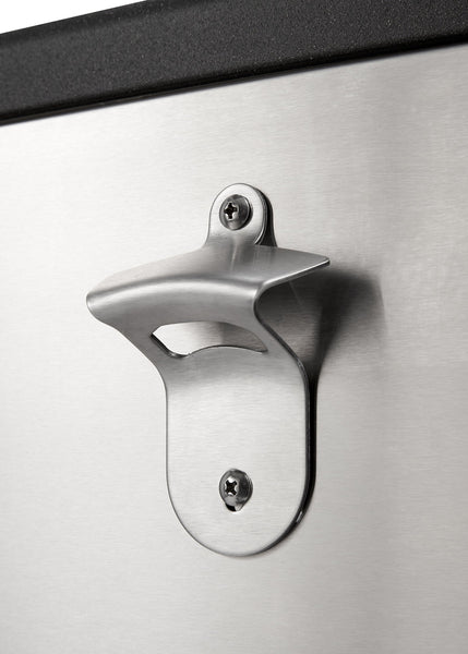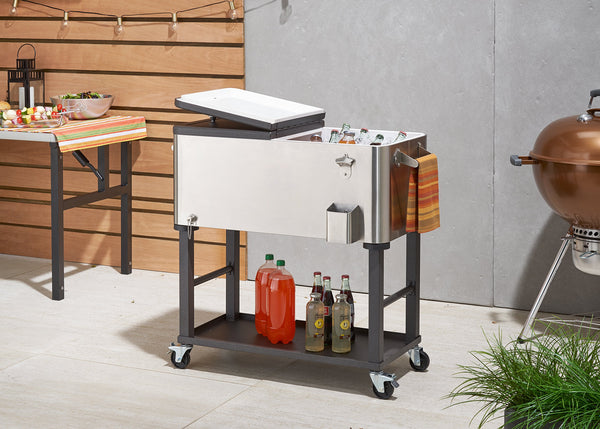 Entertain in style with an 100 quart/25 gallon/120 aluminum can capacity. This sleek stainless steel cooler/ice cart has a detachable tub so you have the option of keeping the cooler mobile, or detaching for easy portability to any game, party, or event. Bottle opener and cap catcher make for easy bottle opening, and the bottom shelf provides extra storage space allowing for easy refills, or anything else that needs to be carted outside.