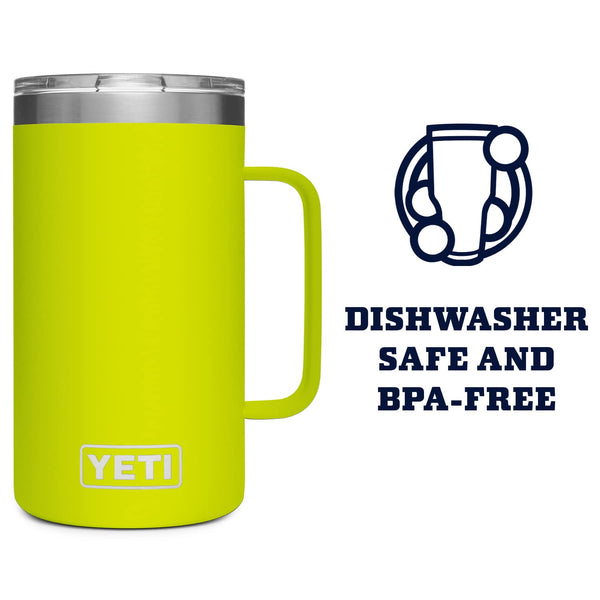 YETI Rambler 24 oz Stainless Steel Vacuum Insulated Mug with Lid Many camping mugs dont stand a chance in the wild. But when youre bleary-eyed, drinking coffee around a campfire in the backcountry, creature comforts like a hot mug of joe give you enough fuel to push on. So we decided to make a mug of our own that could withstand our off-the-grid adventures. The Rambler 24 oz. Mug is made of 18/8 stainless steel, so its durable enough to strap to the outside of your pack and go. Its full-loop TripleGrip Handle is comfortable for wider hands and easy to grab. Itll keep your coffee hot (or water cold) for hours on end and still has the same Rambler features, like No Sweat Design and double-wall vacuum insulation, that makes this drinkware built for the wild.