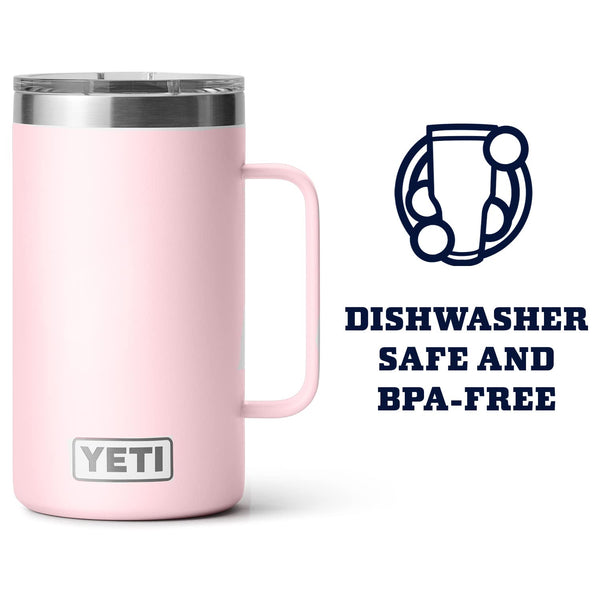 YETI Rambler 24 oz Stainless Steel Vacuum Insulated Mug with Lid Many camping mugs dont stand a chance in the wild. But when youre bleary-eyed, drinking coffee around a campfire in the backcountry, creature comforts like a hot mug of joe give you enough fuel to push on. So we decided to make a mug of our own that could withstand our off-the-grid adventures. The Rambler 24 oz. Mug is made of 18/8 stainless steel, so its durable enough to strap to the outside of your pack and go. Its full-loop TripleGrip Handle is comfortable for wider hands and easy to grab. Itll keep your coffee hot (or water cold) for hours on end and still has the same Rambler features, like No Sweat Design and double-wall vacuum insulation, that makes this drinkware built for the wild.