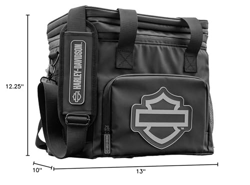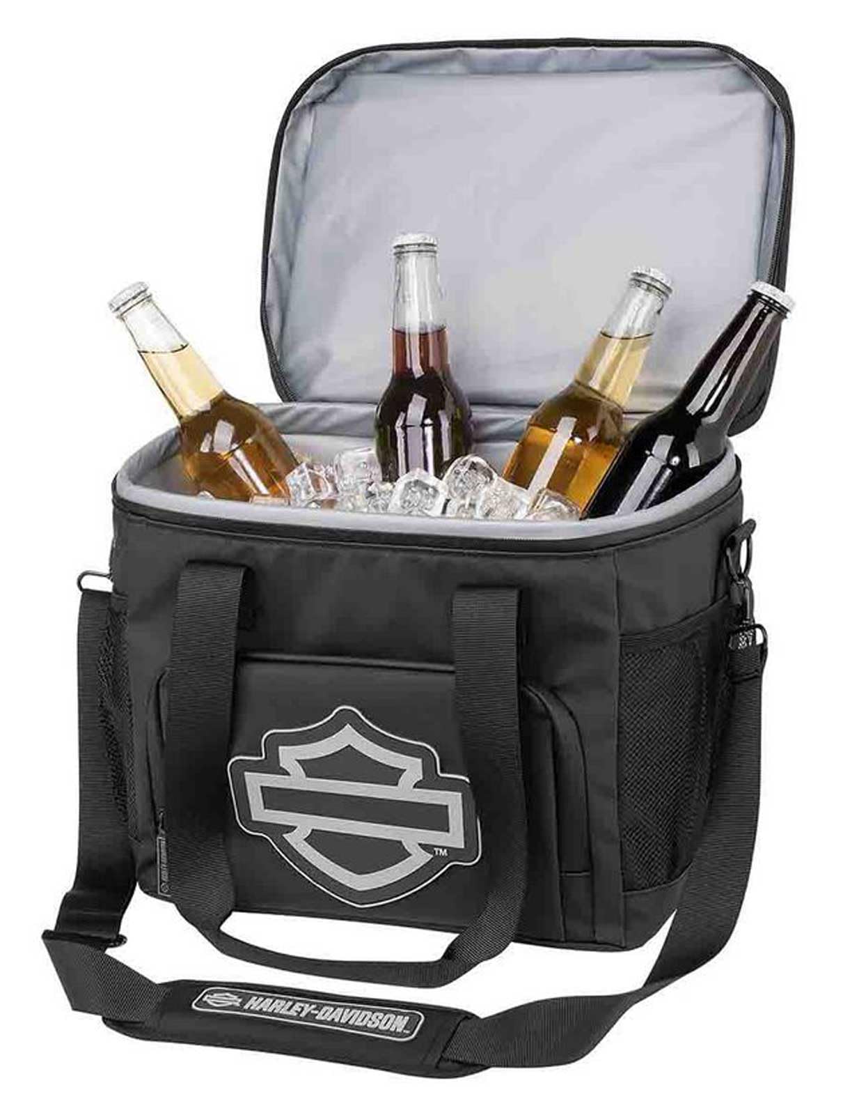Harley-Davidson Open Bar & Shield Soft Cooler - Black, HDX-98547. Custom soft side cooler with rubber Open Bar & Shield emblems and H-D zipper pulls. Leak-proof body and zippers. 24 can capacity. Includes: Side and front pockets, Removable carry strap, Expandable top. Dimensions: 13'' W x 12.25'' H x 10''D.